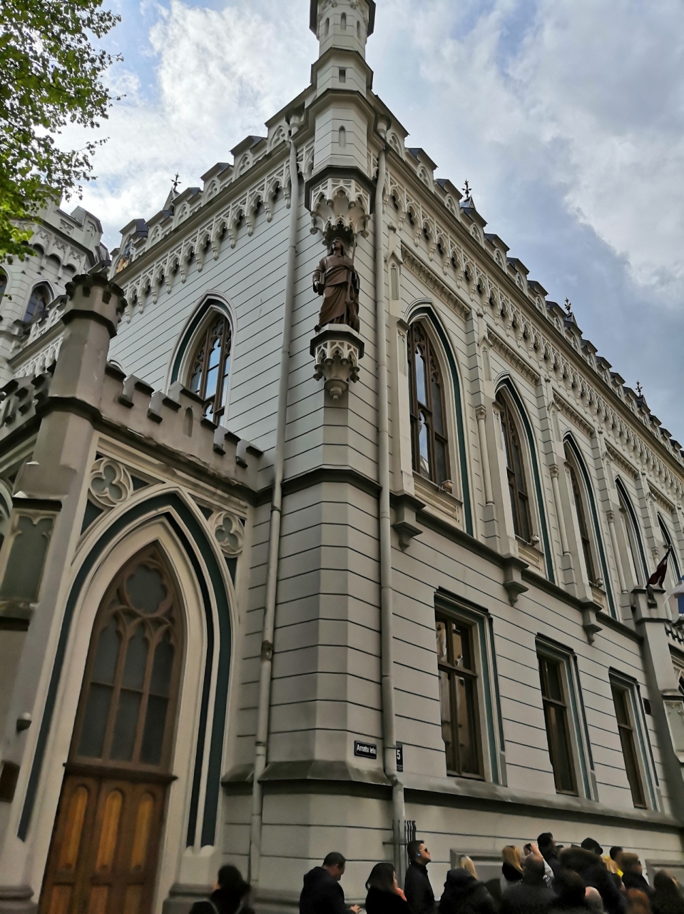 アマトゥ通りを挟んで大ギルドコンサートホールと向かい合うように建っているホールで、職人のためのホールだった建物です。通り側の装飾があったので、通りから写真をとったのですが、広場に面したほうが小さい庭があるので、そちらからのほうが写真取るにはいいかもしれません。