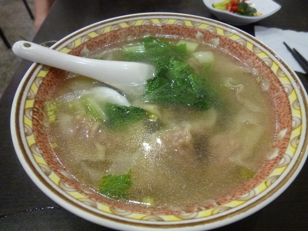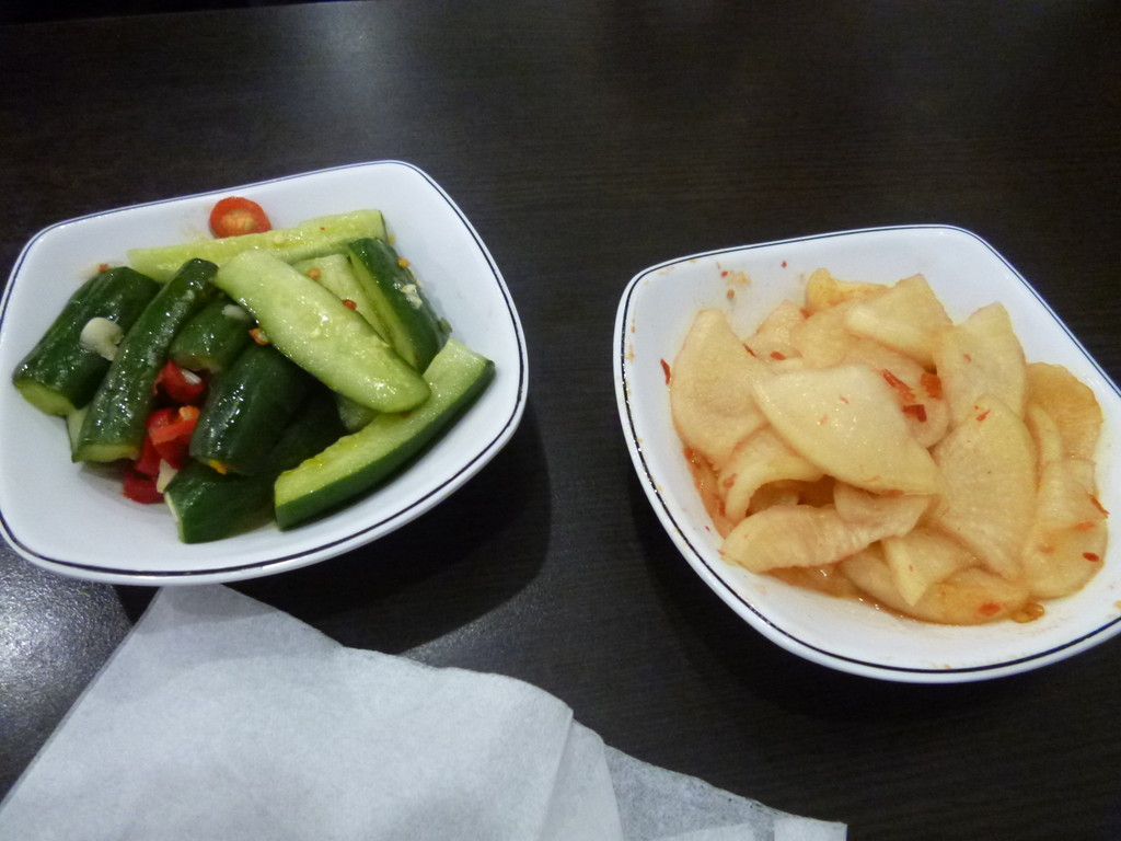 小皿料理は胡瓜と大根の漬物を選び、メインは雲呑を注文、私と妻は雲呑のみ、