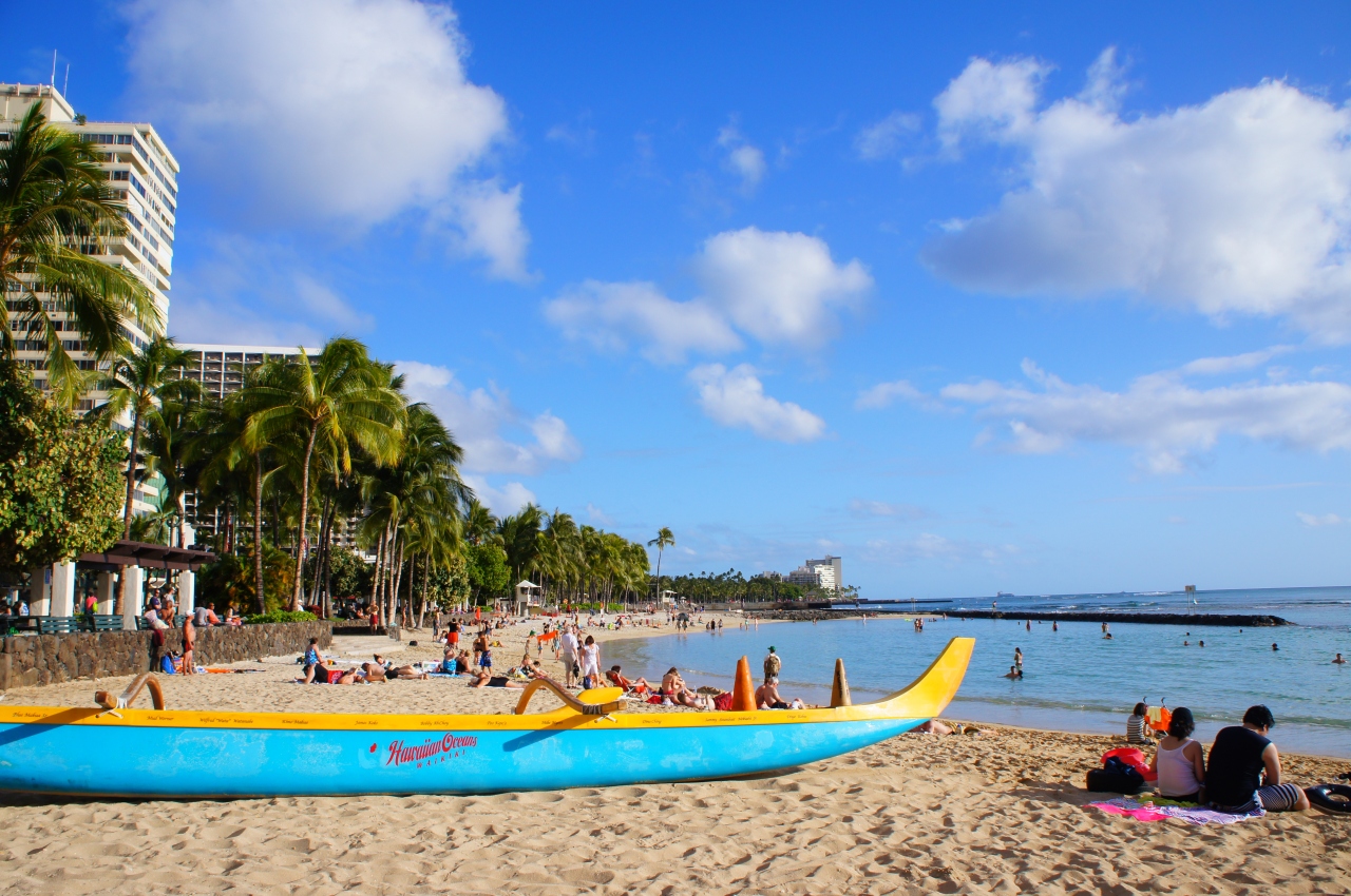 ワイキキビーチ沿いにはリゾートホテルが立ち並び、人も多くにぎやかな雰囲気のビーチです。カラカウア通りを挟まないホテルだったので、ホテルから直接ビーチに出ていくことができました。浅い部分が広いビーチで安全に遊べました。