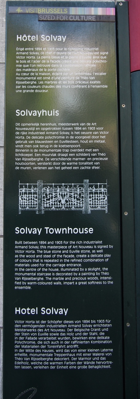 ルイーズ地区あたりには何件かのアールヌーボの建築物があります。全体を見て1-2時間です。ほとんどは外観のみの見学です。それぞれは離れているのでお散歩にはいいですが、全体としての見ごたえとなると・・・おそらく1軒はそれほど大きくないので地味なイメージだからと思います。建築に詳しいかたなら見どことが違うのでしょうが