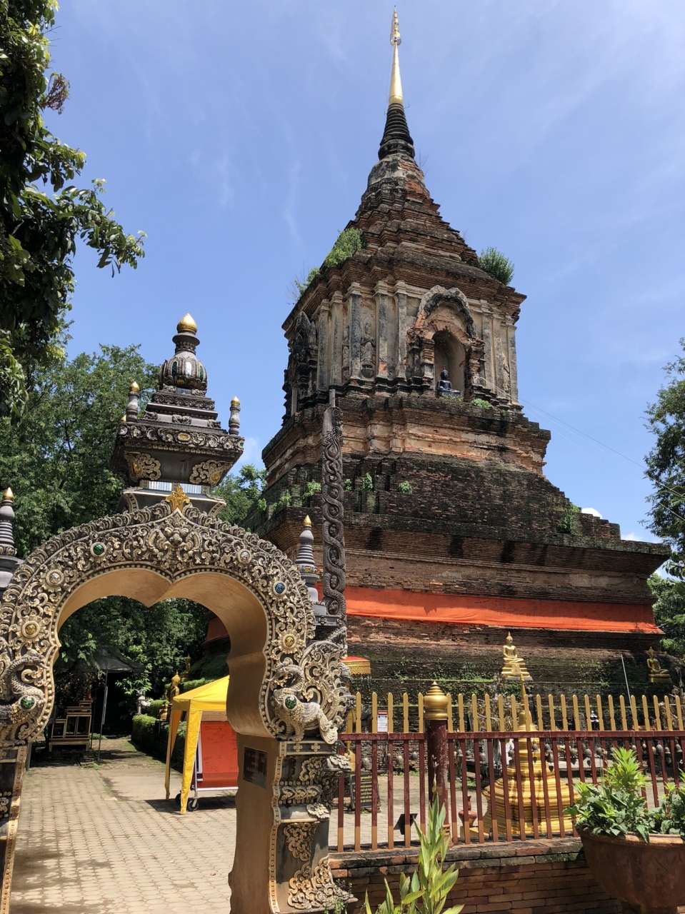 城壁お堀りの北側通りマニノパラッド通り沿いにあります。車で近くを通っても見えますが実際に近くまで行って見学するのがオススメです。大きな仏塔の中腹にはロープが張ってあり何らかの操作が出来るようになってましたが儀式の意味は理解出来ませんでした。