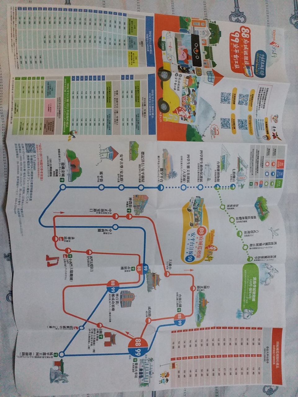 台南観光の際、何度も利用しました。88と99の二路線あり、台南の主要な観光名所へのアクセスに重宝しました。便数が少ないで一時間に2本程度なので、観光の呼吸も30分を一つの目安にして動きました。市内中心からは30分ほどかかりますが、安平古城へも行くことが出来ました。台北で購入した悠遊カードが使えたので、乗り降りもスムーズでした。市内にある台南駅のツーリストインフォメーションでもらった地図兼時刻表が重宝しました。路線図は写真をご参照ください。