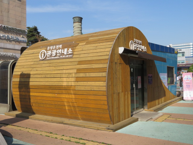今回は天安総合バスターミナル前から路線バスを利用して温陽温泉駅前まで来ました、駅前広場に牙山市温陽温泉観光案内所があるので日本語のパンフレットをもらい役に立てました。