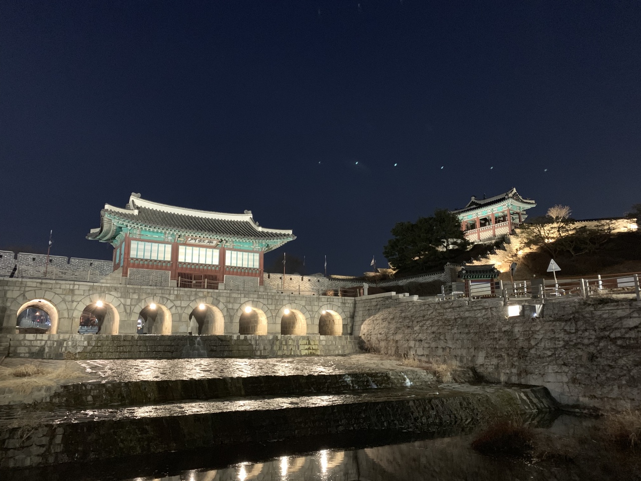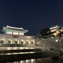 夜はライトアップが綺麗です。隣の訪花随柳亭と併せて撮ればインスタ映えもバッチリ。2月で川の流量が少ないのもあり、日中はちょっとガッカリでした。ゴミとか見えちゃうし。ちなみにヨンボカルビが徒歩1分です。