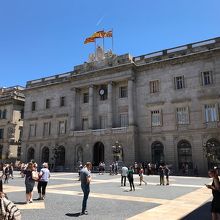 サン ジャウマ広場の中心的な建物です。向かい側はカタルーニャ州庁舎(自治統領館)です。正面にギリシャ風の列柱があります。カタルーニャ州庁舎との区別はこの列柱の有無と旗の数です。カタルーニャ州庁舎が2つなのに対し、こちらは3つです。
