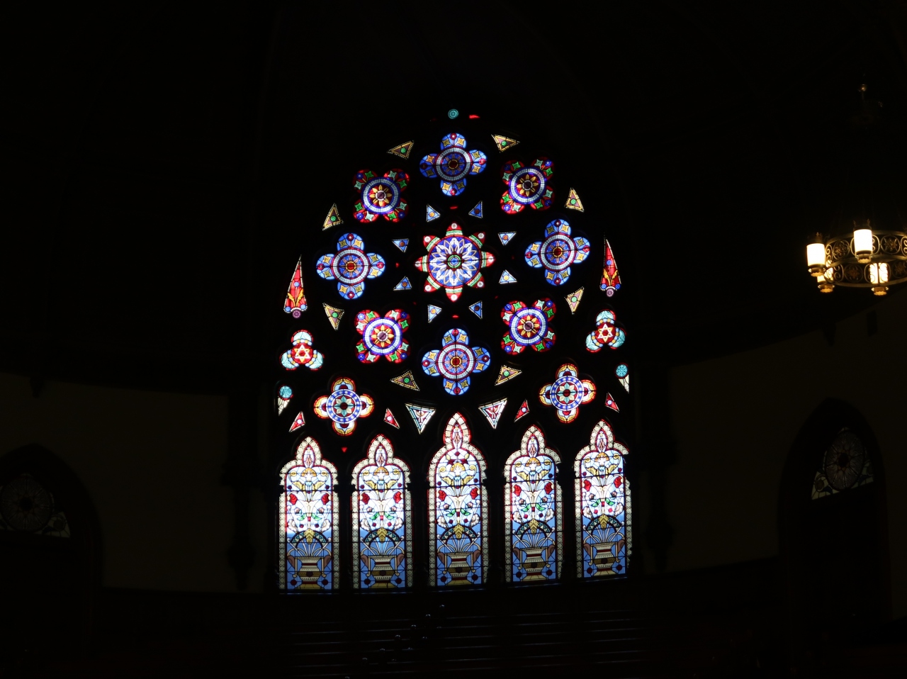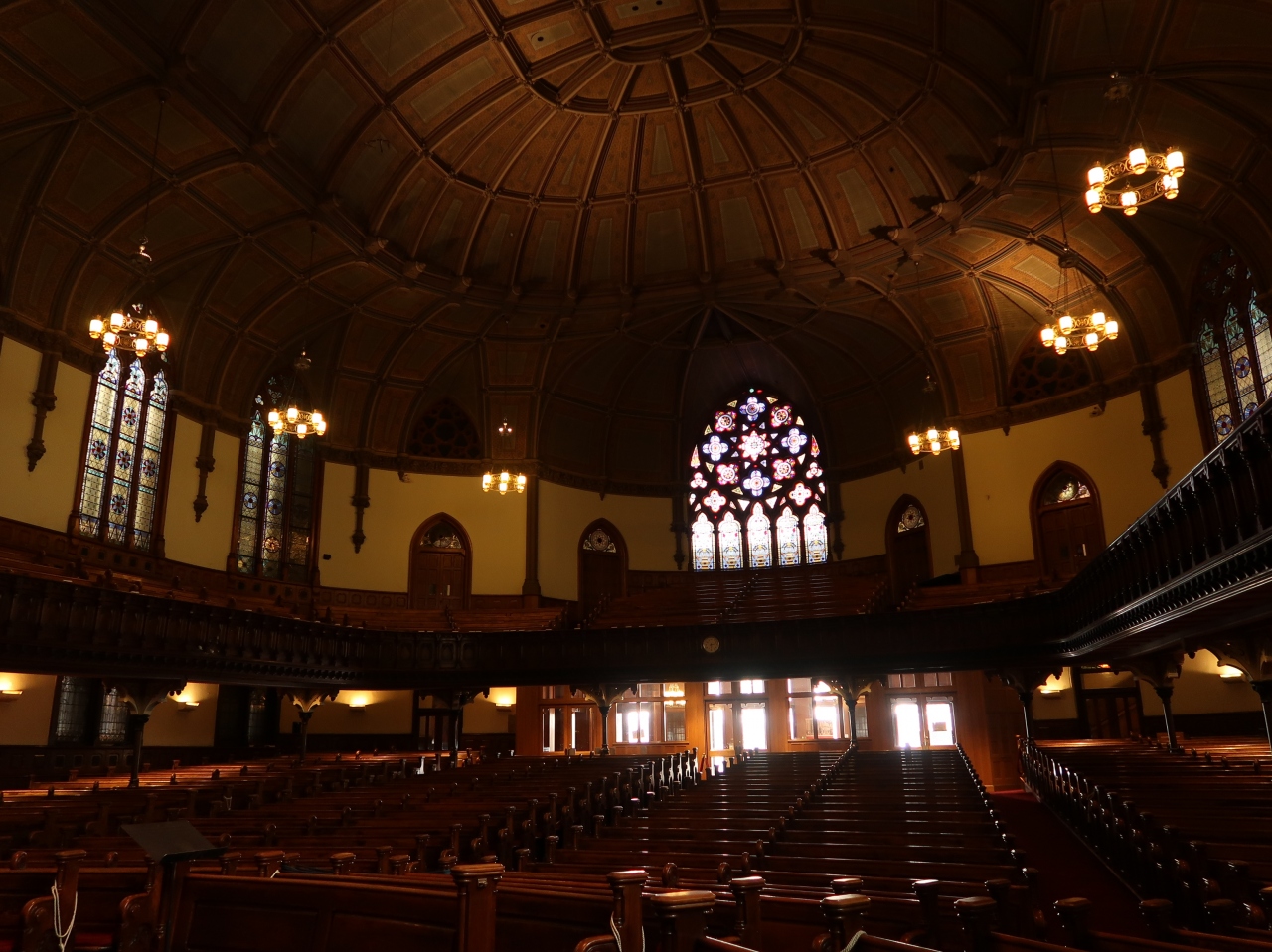 こちらの長老派教会は、木の大ホールがとても美しい、歴史を感じさせる建物で、浮かび上がるステンドグラスの美しさに息をのみました。