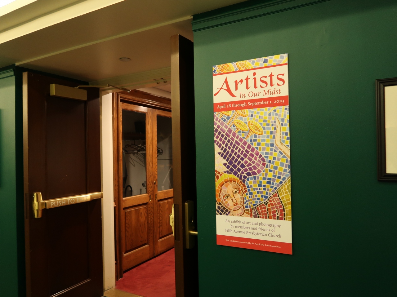 木の大ホールが美しい長老派教会。アートも素敵です。