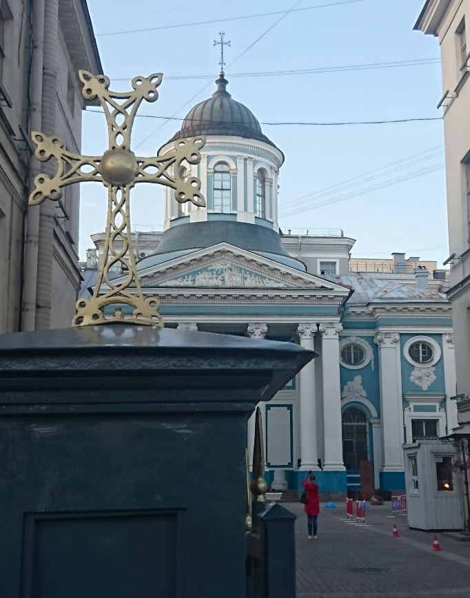 サントペテルブルグ旧市街の地下鉄ネフスキープロスペクト駅から出てきた時に見つけました。ネフスキープロスペクトの中心びありますが教会の建物は敷地の奥にありますので見逃す可能性があります。カソリック教会の構造に近いオーソドックスなフォルムです。きれいな十字架が目印です。