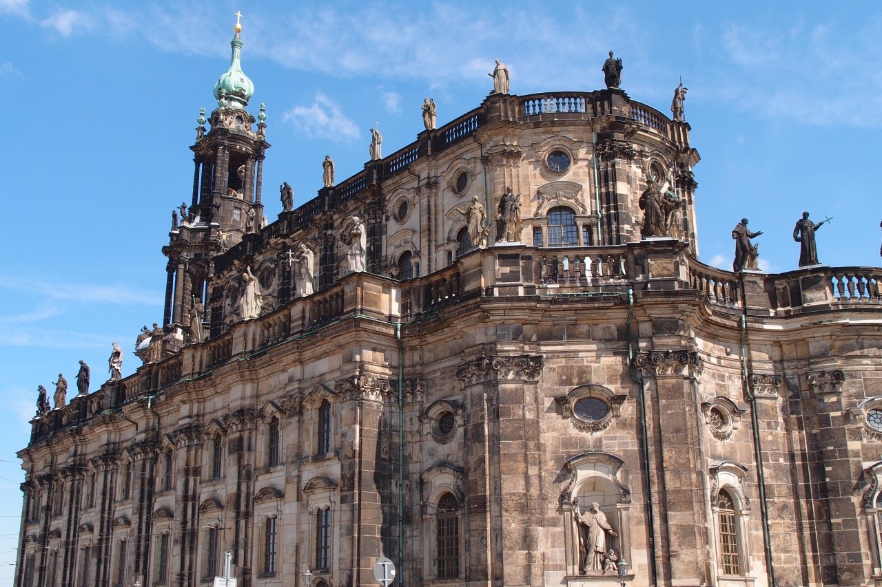 83メートルの塔と屋根に78体の聖人像が並ぶドレスデンの大聖堂です。遠くからは隣に建つレジデンツ宮殿と一体のように見えます。