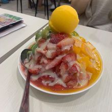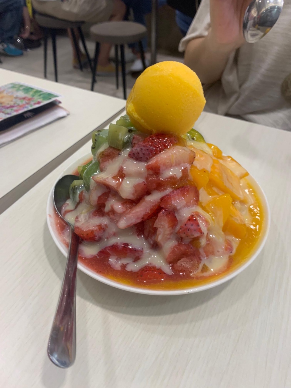 席についてお隣をみたら大きなマンゴーかき氷を食べておられてシェアするにしても飽きるなってことでキウイ・イチゴ・マンゴーのMIXにしました。