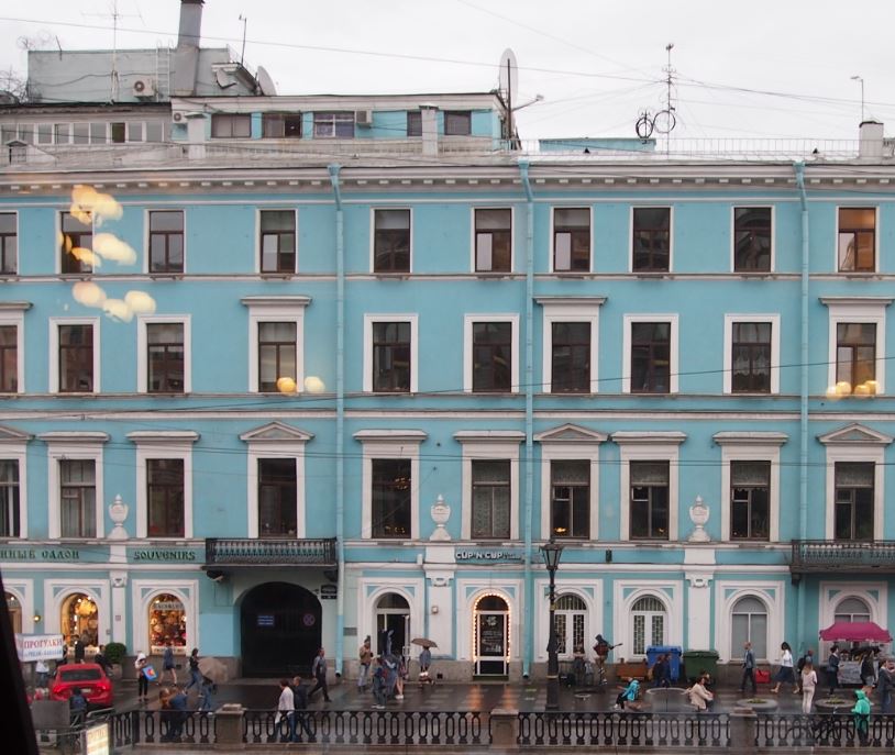 ネフスキープロスペクトとクリボエードフ運河の交わる場所にあるひときは可愛い薄いブルーの建物が日当たり側の看板 (Solnechnaya Storona)です。ネフスキー・プロスペクト側には地下鉄の出入口があり、運河沿いはカフェになっています。