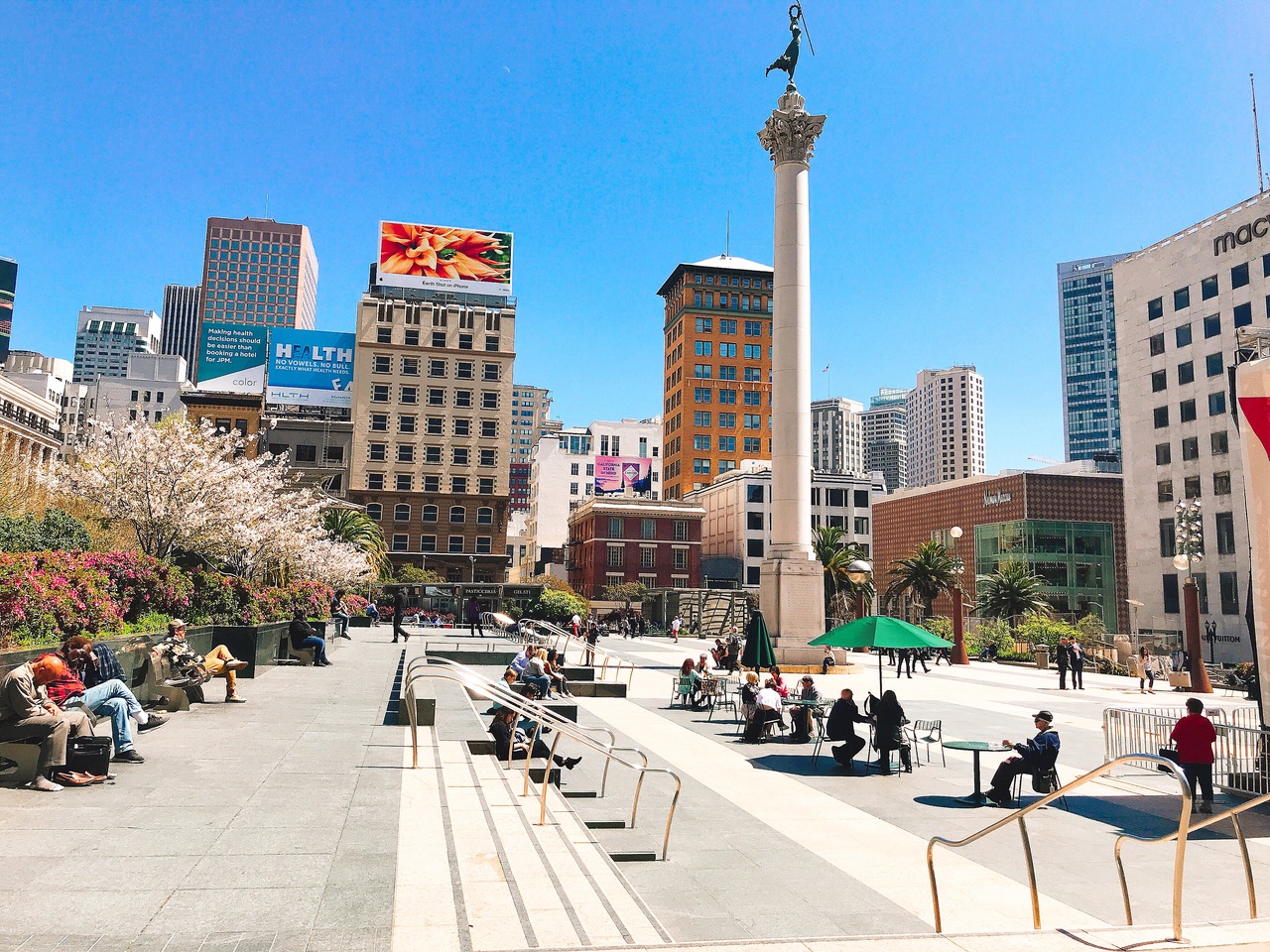 ユニオンスクエアの周りは高級ホテルや高級百貨店が立ち並んでいてとても良い立地にあります。ユニオンスクエアの入り口、対象にそれぞれ置いてあるハートのオブジェが印象的でした。ユニオンスクエアの中では色んな人がおしゃべりしたり休憩したり