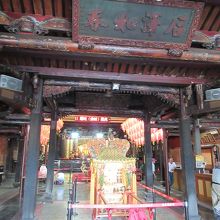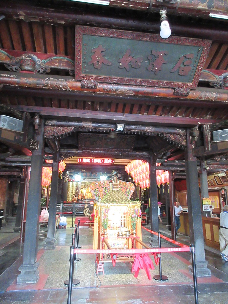 石柱や梁の見ごたえある装飾は、台北の龍山寺を彷彿とさせる芸術作品です。