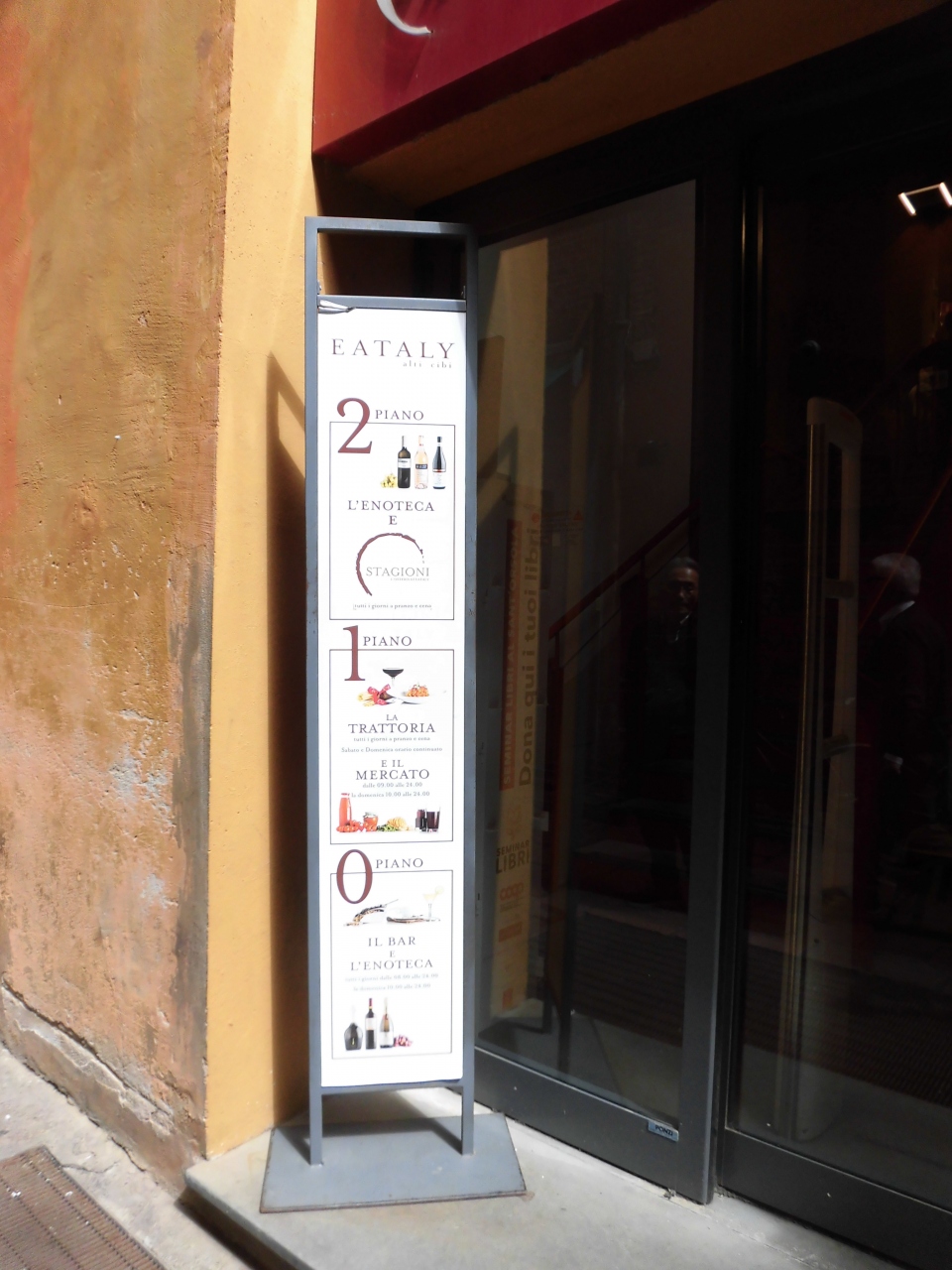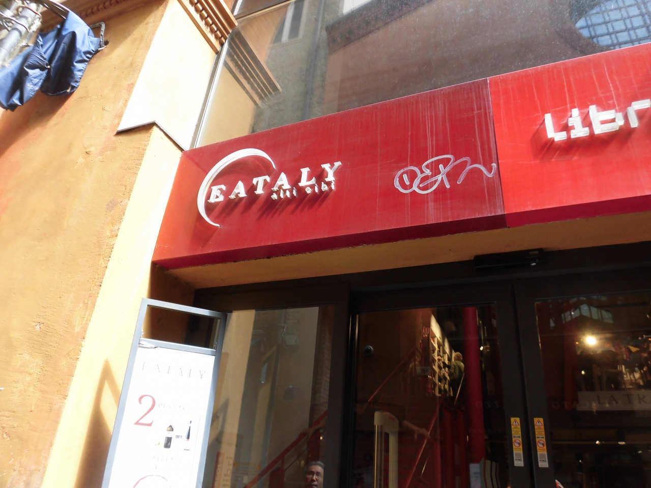 新鮮な野菜や魚介類、肉、ワインやチーズが並びそれらをイートインの出来る店やレストラン等が並ぶ通り。 ここの一画に「イータリー」がありました。 一階は雑貨や食料品の売り場、二階にはレストランやイートインがあります。 以前、夜に訪れたときは満席で、店の中も混雑していました。 今回午前中でしたので、食事スペースはまだオープン前、雑貨コーナーも店員さんは不在でした。 開店直後だったみたいです。