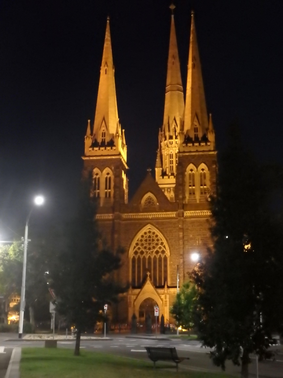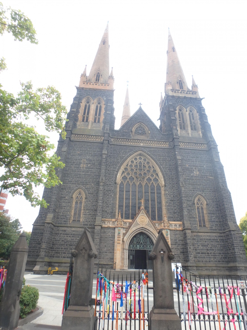 シティサークル・トラムを使って、パーラメント駅からゆっくり歩いて5分くらいでした。遠目でも高さ103メートル尖塔が見えてきました。流石に、オーストラリア最大のゴシック建築だと痛感しました。実際に近づき過ぎると、カメラに収まらないので、広角レンズが無ければ、近づく前に撮影することを忘れずに。