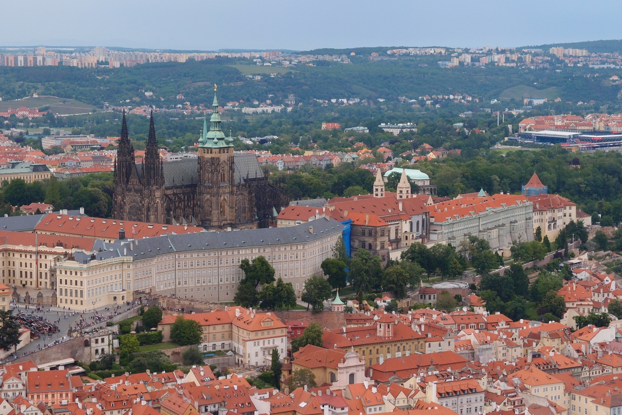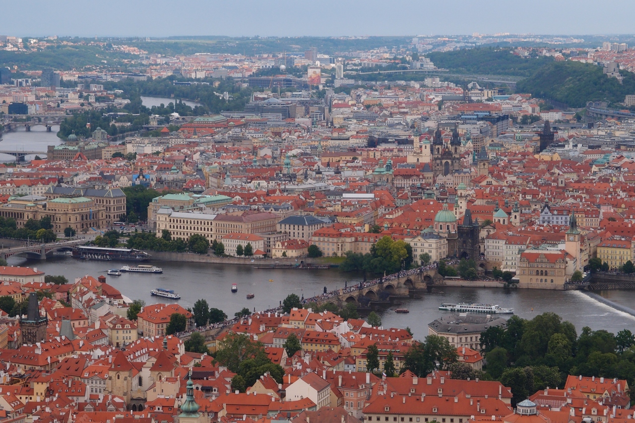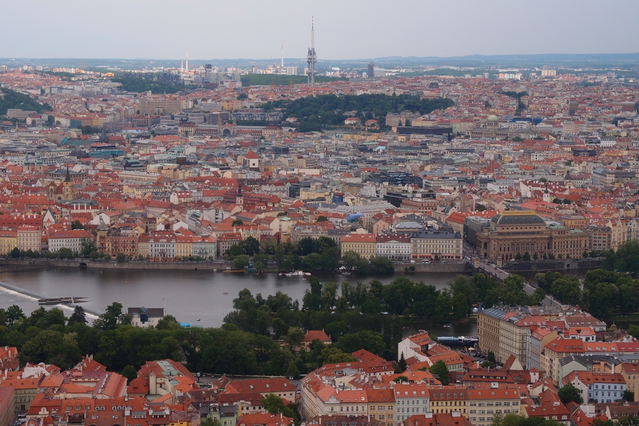 ウージェズダからケーブルカーで行き、有料のエレベーターで昇りました。展望台からはプラハ城を見下ろす視点で、カレル橋や旧市街など360度の景観を楽しめました。展望台周辺の公園は多くの親子連れで賑わっていました。