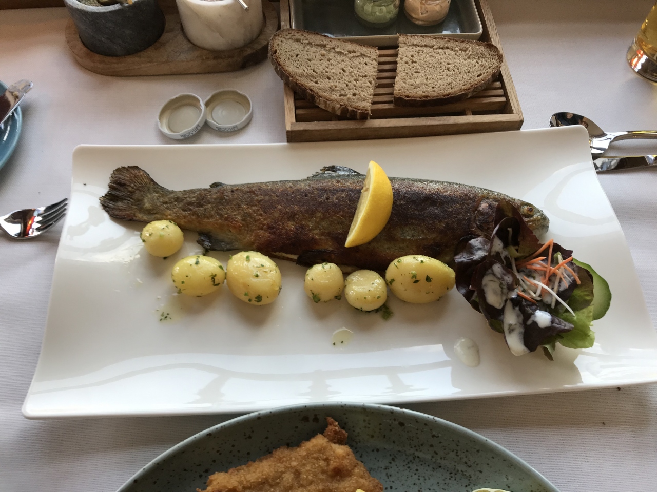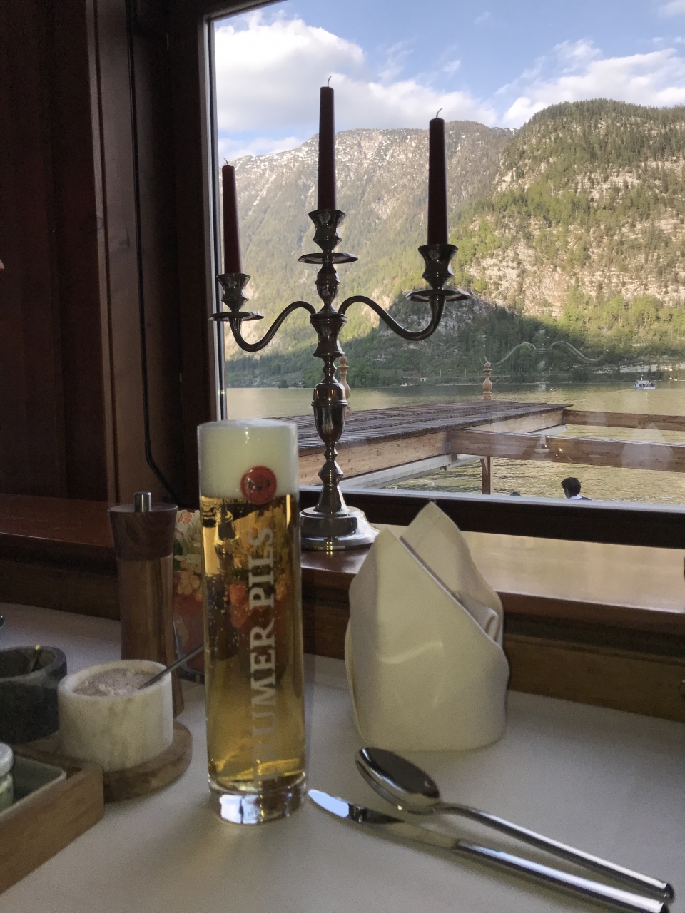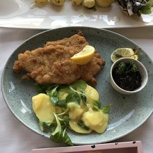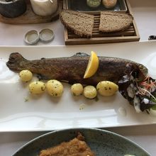 シュニッツェルとハルシュタット名物だというマスのグリルを注文しました。マスはかなりの大きさで、見た目のインパクトも凄かったです。名物の岩塩でいただけたのが良かったです。宿泊者の朝食会場もこちらでした。