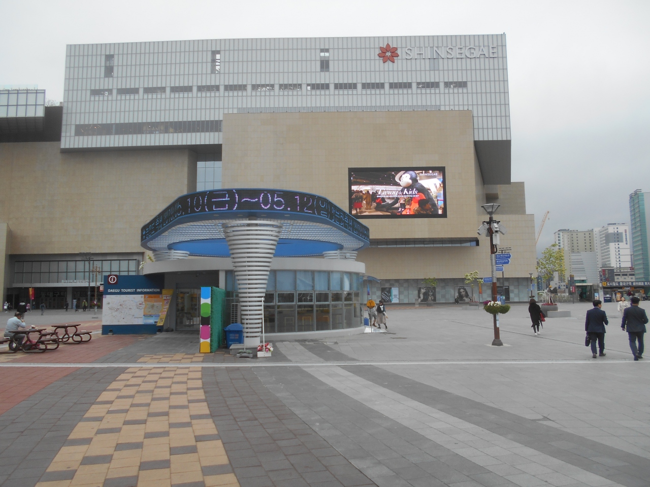 海雲台から東大邱までバスで移動しました。バスターミナルと東大邱駅はすぐ隣の建物で路線バス乗り場やデパートなどもあり、交通の要所になっています。 東大邱駅前の広場にはガラス張りの観光案内所があり、大邱周辺の日本語パンフレットもありました。