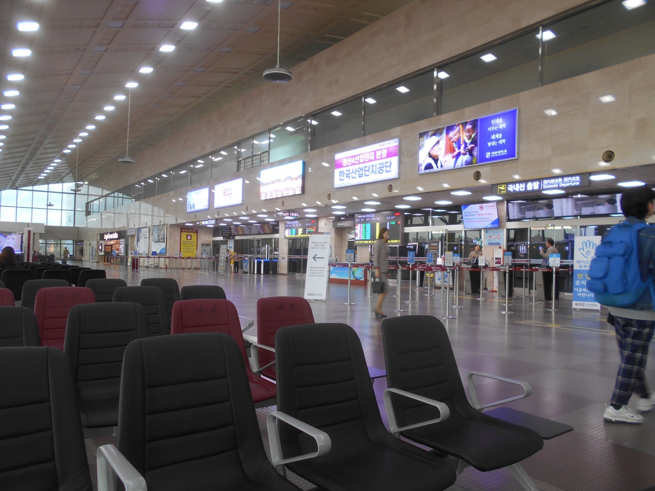 東大邱駅から路線バスで大邱空港へ行きました。乗り場が分かり難かったので、駅前広場にある観光案内所で教えてもらいました。バスは頻繁にあり分かりやすかったです。小さい空港だけど、カフェやレストランやコンビニもあり、前の広い通りを渡るとコンビニや小さな市場もあります。
