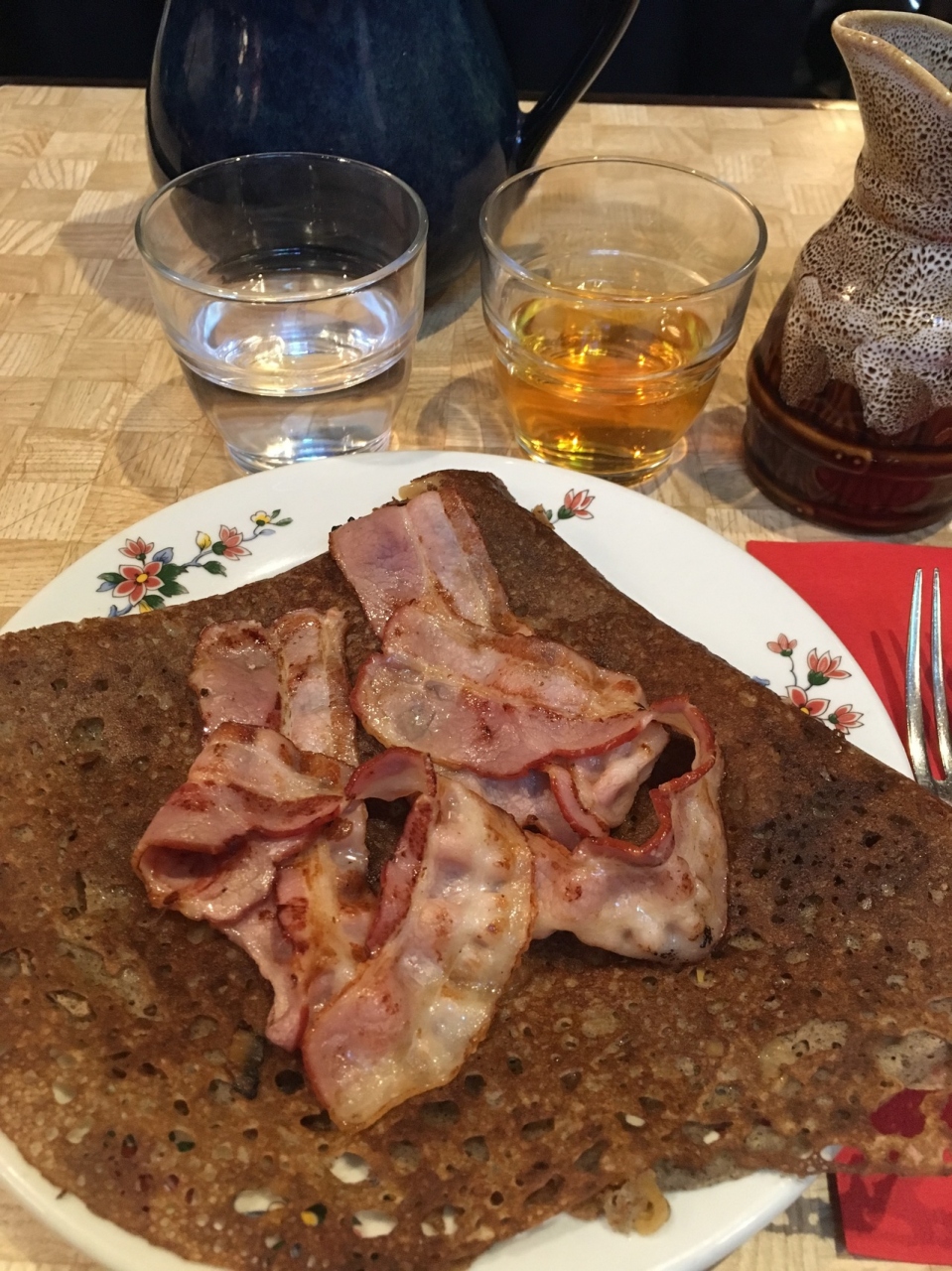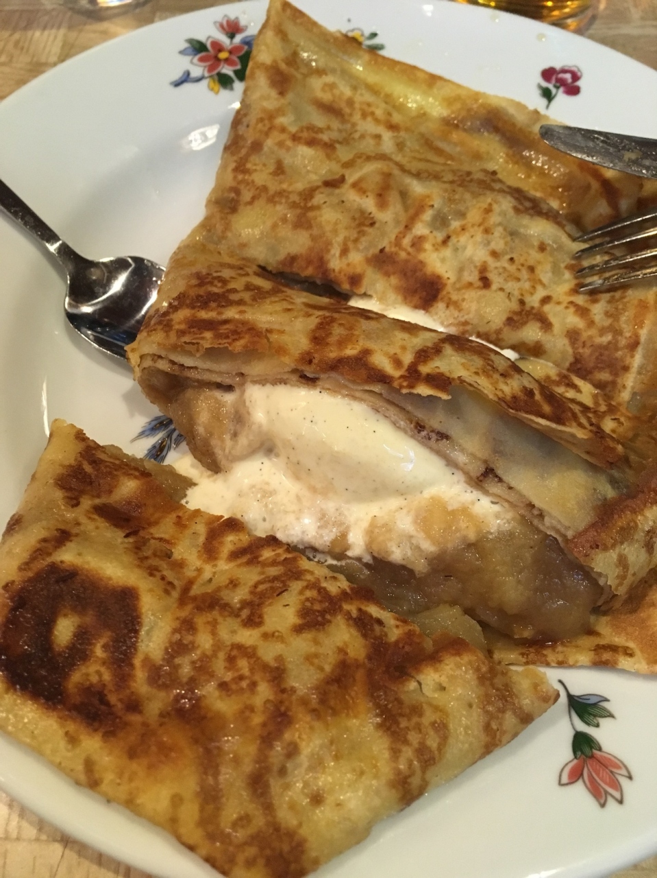 ガレットやクレープのお店が多いモンパルナスの中でも有名店という事で行ってみました。お昼の時間をずらして14時くらい、まだ賑わっていましたが座れました。ガレットはベーコンとオニオン、その後りんごとバニラアイスのクレープを注文。運ばれてきたガレットを見て、日本のガレットは本当におしゃれだと実感しました。オニオン入りの生地にドーンとベーコンを乗せただけのシンプルさ。とは言えくせになる美味しさ。クレープはアイスが中に包まれていて熱々クレープと冷たいアイスの組み合わせがとても美味しかったです。お店のスタッフも気さくでした。