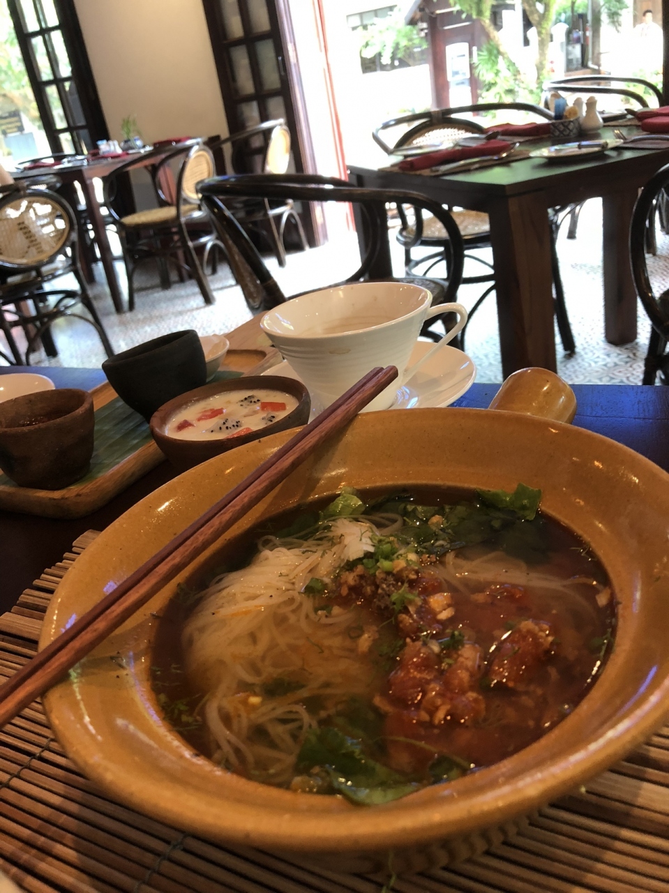 泊まっているホテルの近くだったのでルアンパバーン初日に行きました。カオソーイが食べたかったがメニューに無く代わりに「カオ ピアック セン」を勧められて注文。たっぷりのハーブともっちもちの米麺。優しいお味のスープに写真を撮るのも忘れ完食。気に入って2日後にも再訪。ピザやデザートなどどれも美味しかったです。