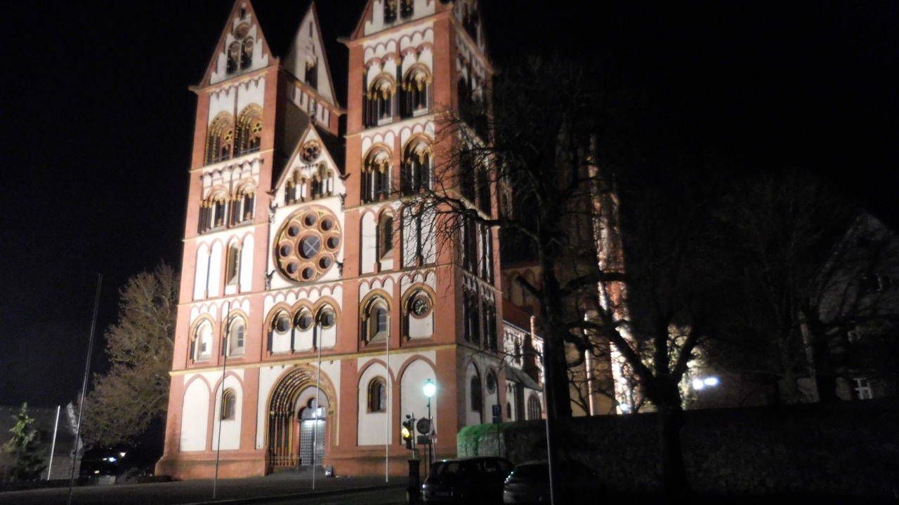 大聖堂は旧市街の北東の丘の上にある。正面から見るとバラ窓が左右対称の2本の塔で挟まれた独特の形で、中部ドイツ特有の白壁に赤茶色のレンガ鮮やかである。内部はグレーの石造りで何層も重なったアーチは重厚である。