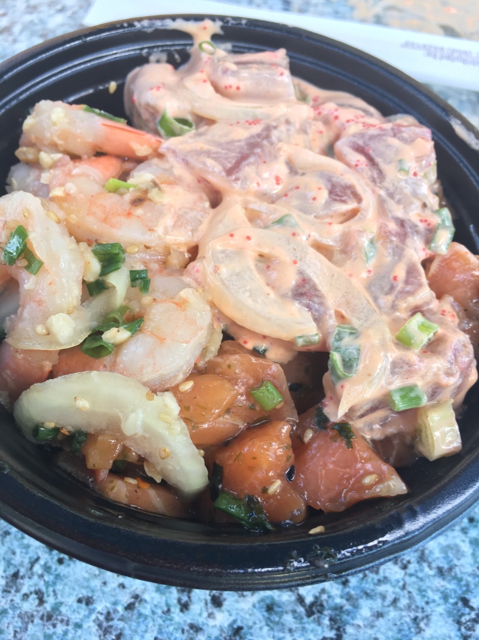 レアレアトロリーが止まるので、雰囲気も良かったので、行きました。雰囲気は最高でした。ポキを選んで丼にしました。三種類で11ドルちょっとしましたが、コココーブの丼の3分の2くらいで量は少なめ。サーモンは少し臭かった。ご飯もあちこち硬くて、何日前のご飯?て感じ。アヒは美味しかったです。アヒと海老にしとけば良かった。