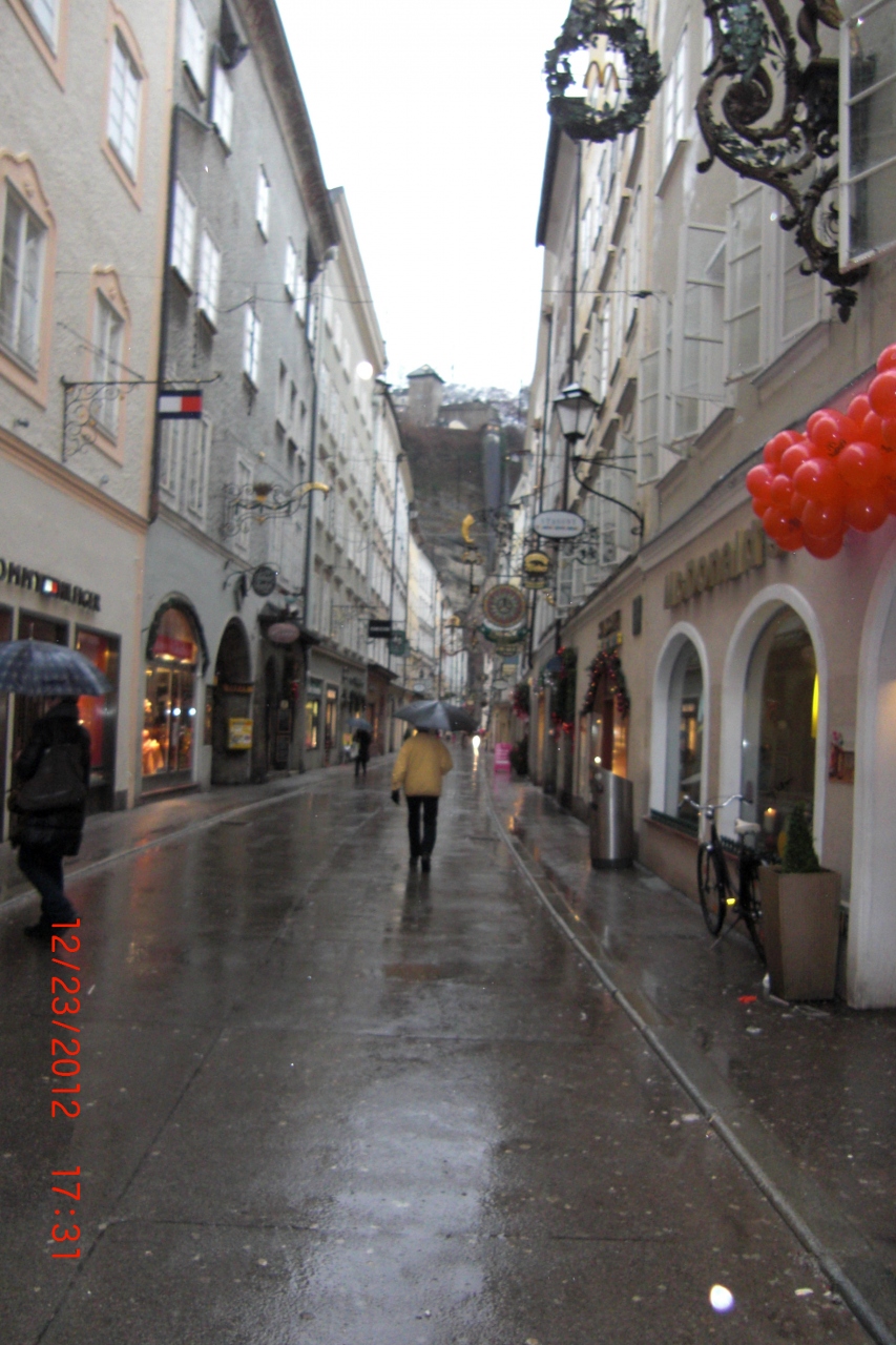 厳寒の冬を覚悟して行ったのですが、暖冬で雪は解けてしまったそうです。小雨が降り、午前中ということもあって、人影はまばらでした。この通りのほぼ中央に、モーツアルトの生家という黄色い建物もあり、2階には、彼が小さいときに弾いたというクラヴィーアなどがありました。