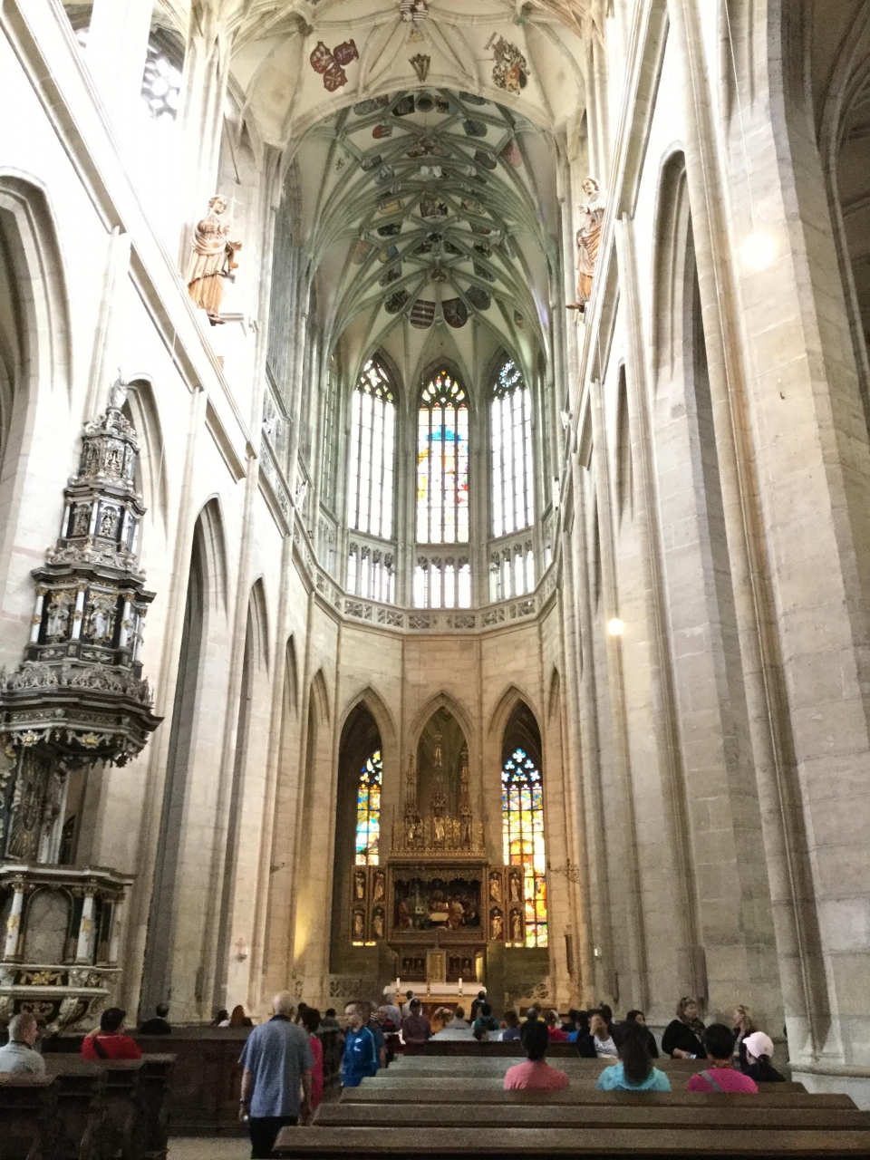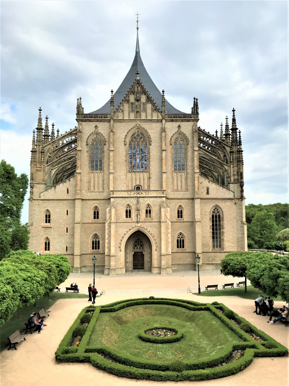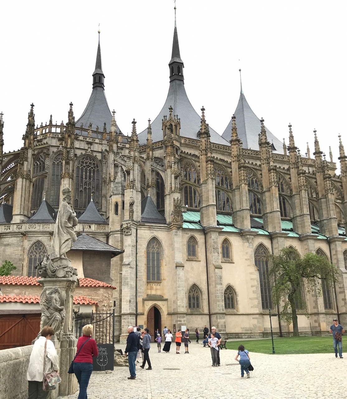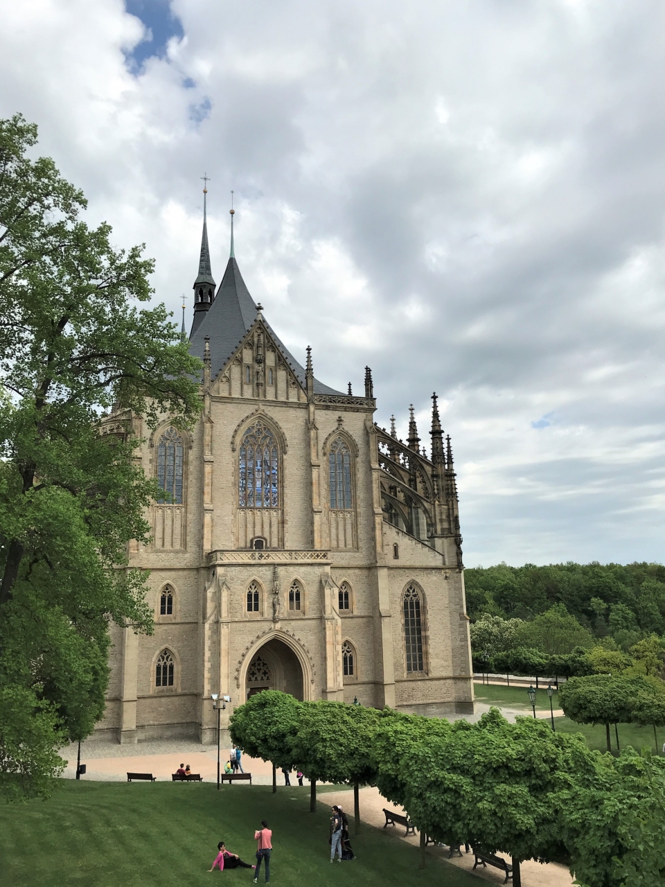 旧イエズス会大学前の彫像が並ぶ道を登って行くと聖バルバラ教会が見えてきます。広いテラスがありクトナー・ホラの綺麗な街を見渡せます。教会内のヴォールト様式の天井、ステンドグラス、フラスコ画、主祭壇、15の礼拝堂など、全てが見応えのある素晴らしいものばかりでしたが、二つの全く違う外観に驚かされました。教会内だけでなく周囲の森や緑も綺麗でした。