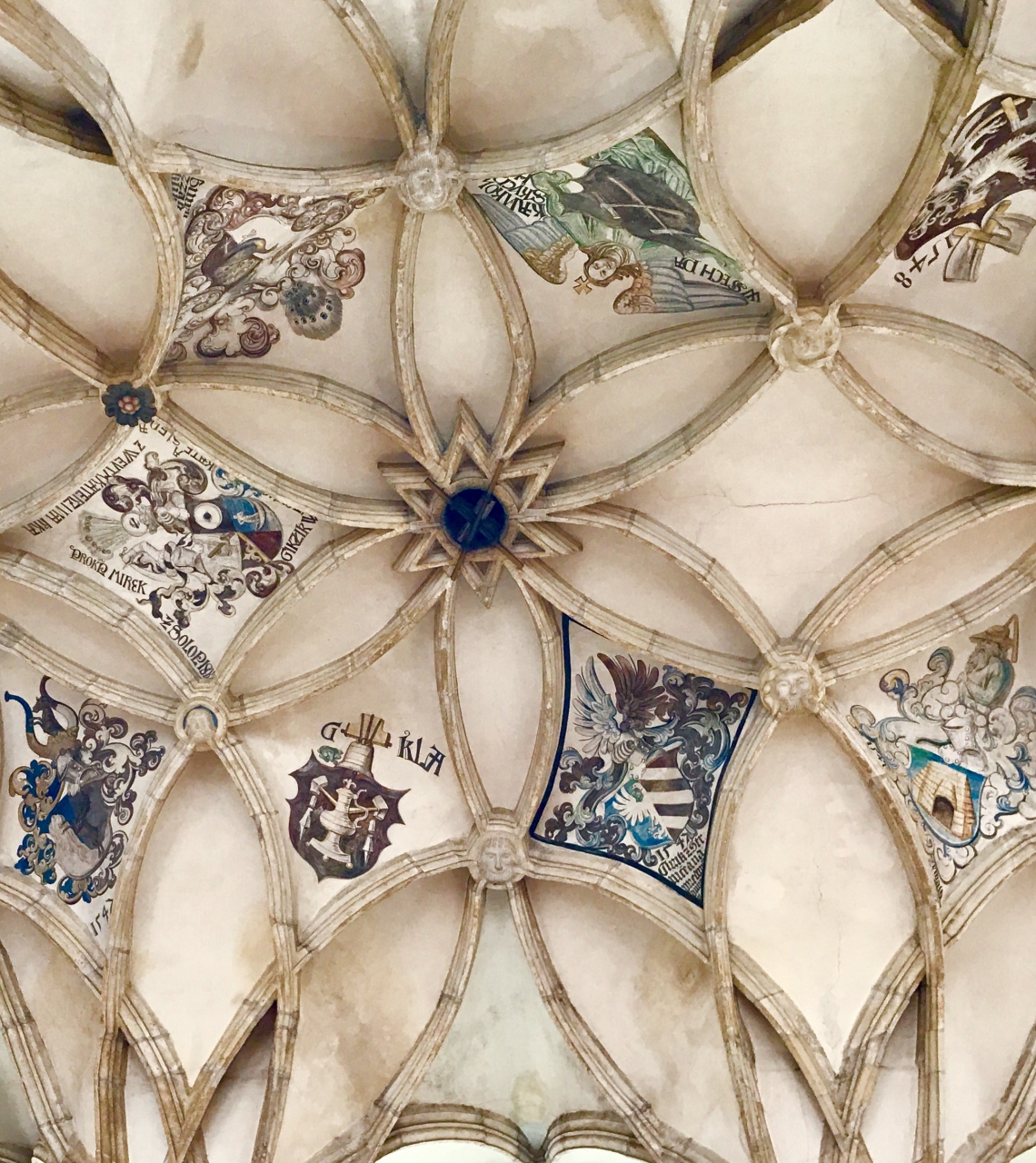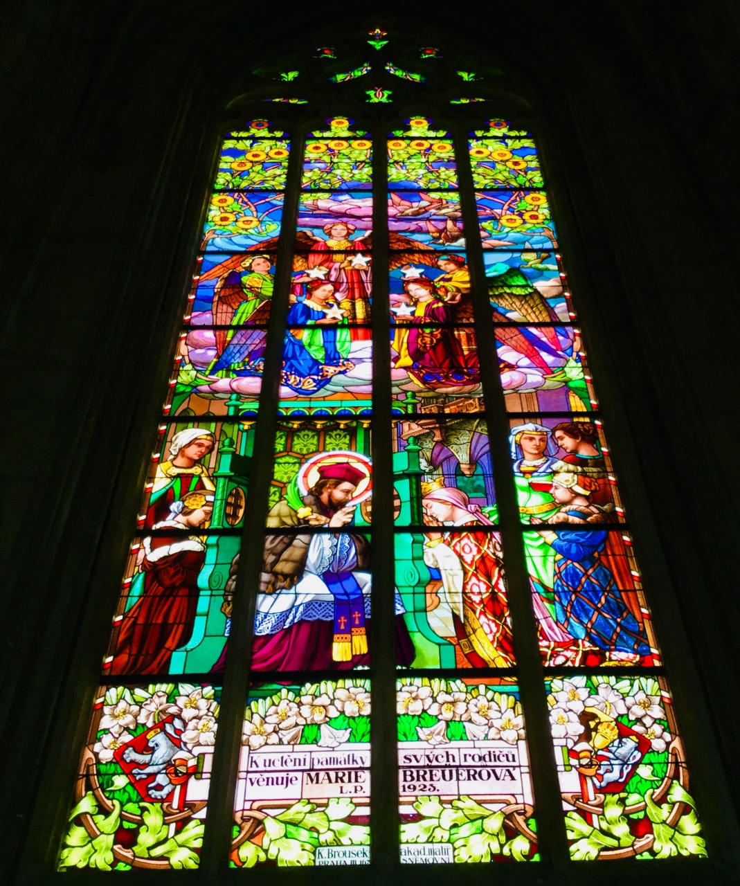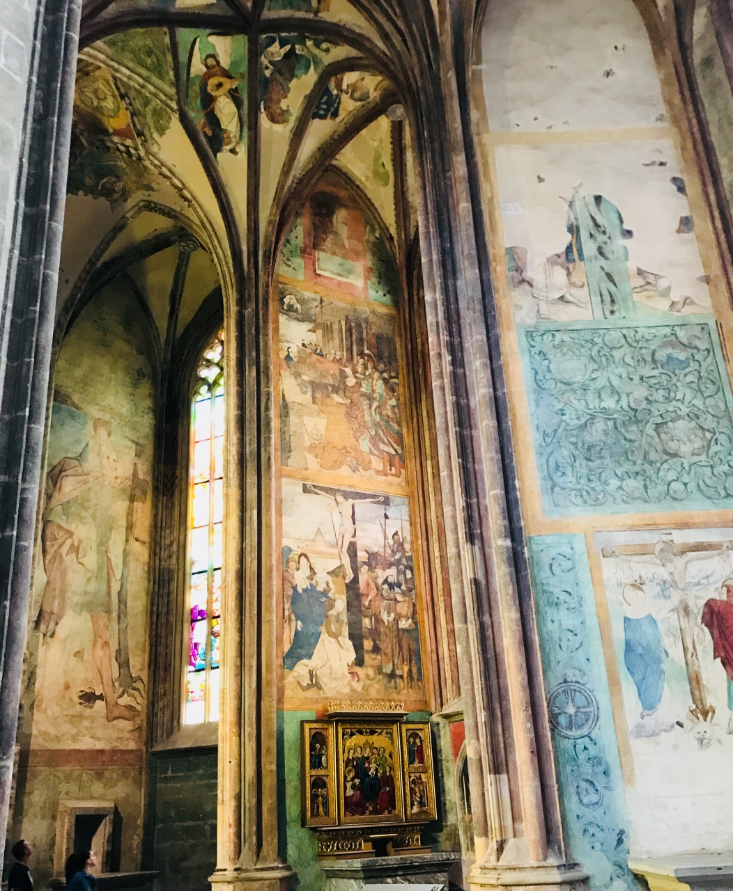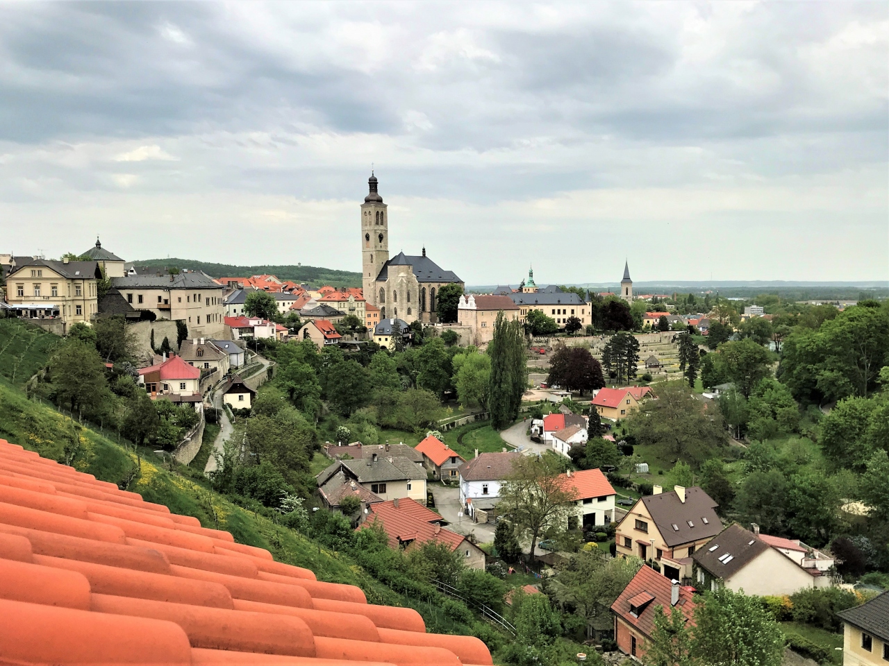 旧イエズス会大学前の彫像が並ぶ道を登って行くと聖バルバラ教会が見えてきます。広いテラスがありクトナー・ホラの綺麗な街を見渡せます。教会内のヴォールト様式の天井、ステンドグラス、フラスコ画、主祭壇、15の礼拝堂など、全てが見応えのある素晴らしいものばかりでしたが、二つの全く違う外観に驚かされました。教会内だけでなく周囲の森や緑も綺麗でした。