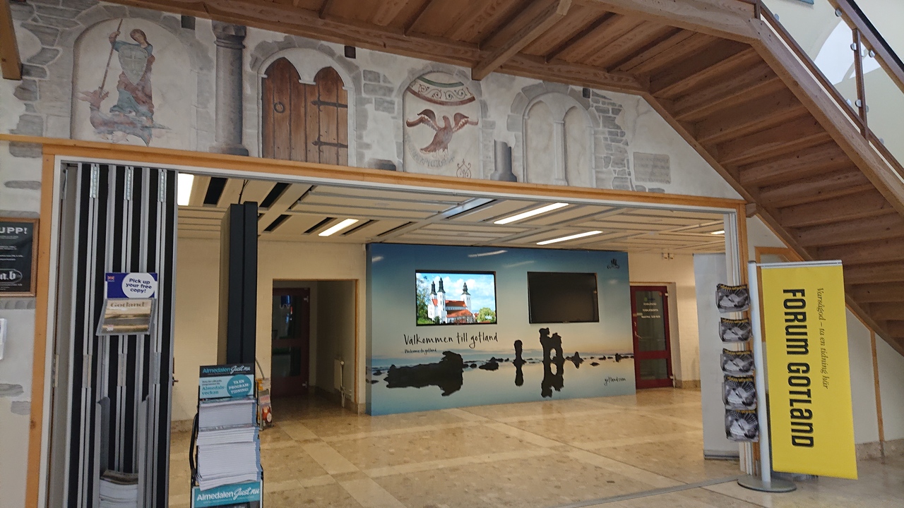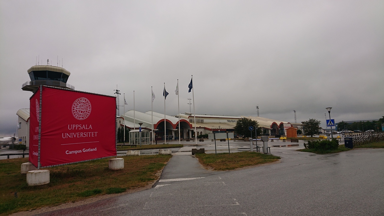 ヴィスビューの旧市街から約4km.6月下旬から8月中旬まではバスがありますがその他の季節は公共交通機関はタクシーのみ。レンタカーで移動する人が多いようです。歩いて空港に向かう人も見かけました。タクシーは見かけましたが繁忙期以外は予約した方が良いようです。