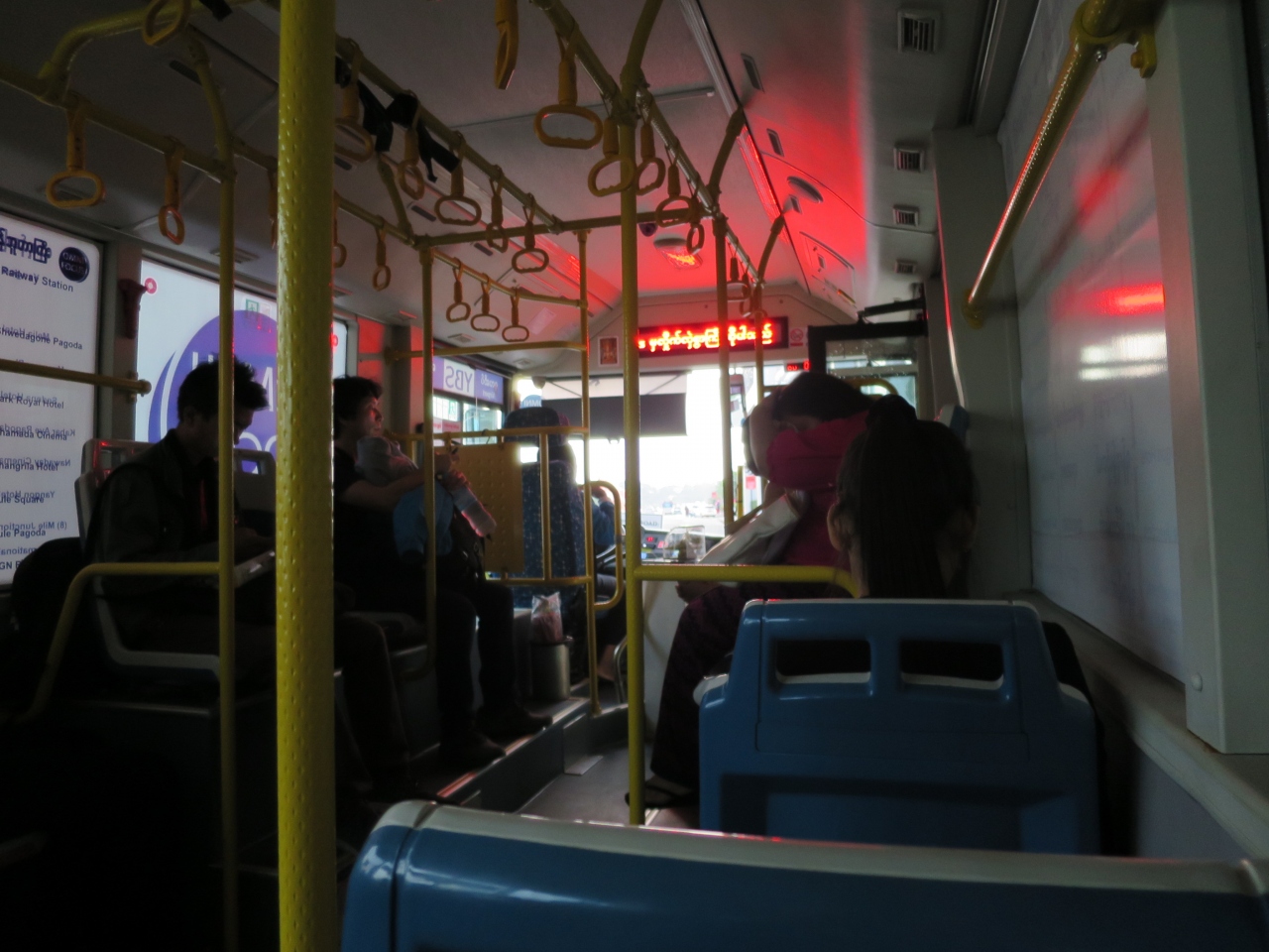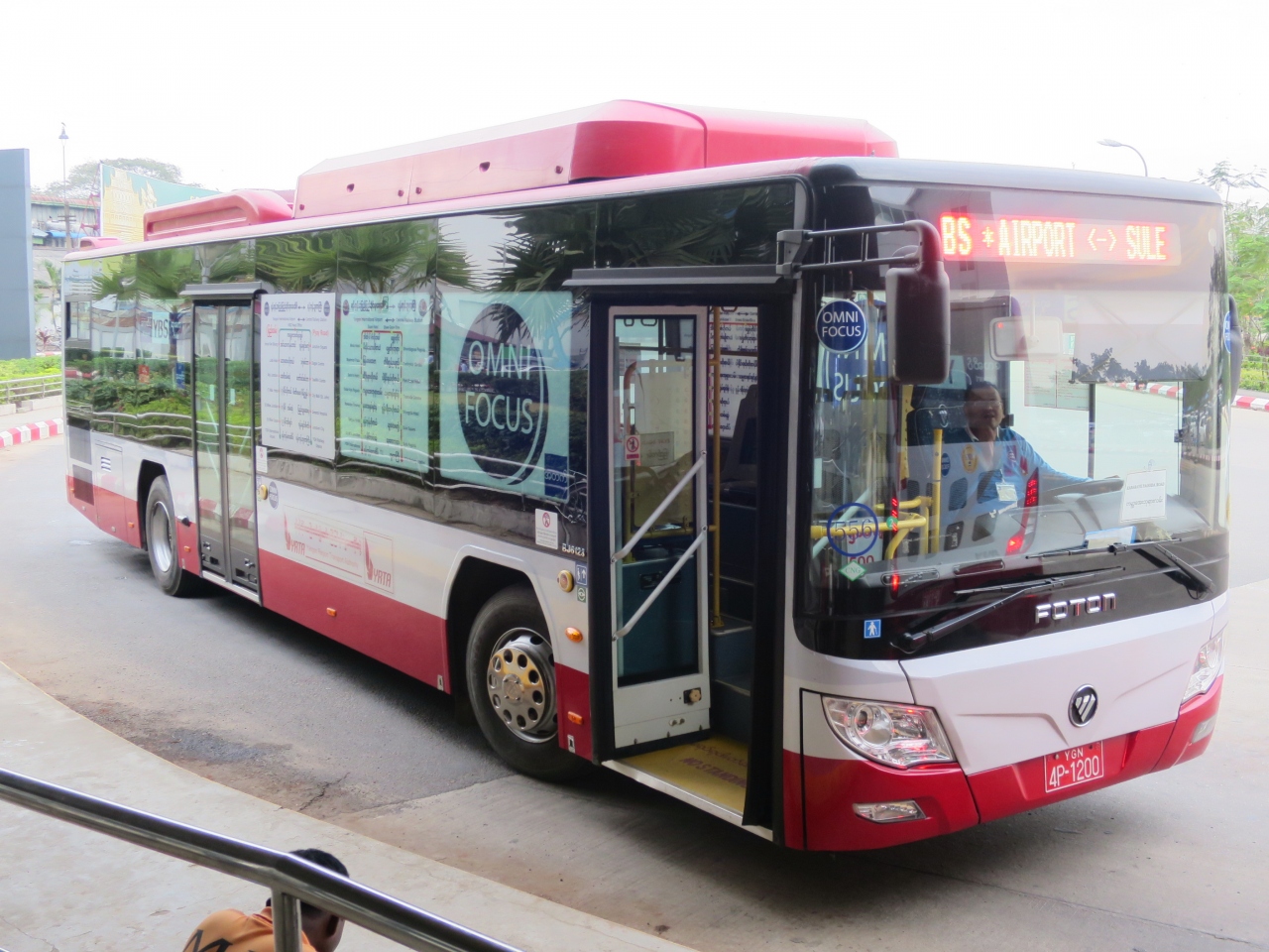 空港シャトルバスはヤンゴン市内を一周するように走るので、スーレーパゴダやシュエダゴンパゴダなど観光名所への移動にも便利です。一般の路線バスが200チャットであるのに対して空港バスは500チャットと割高ですが、バス自体はきれいで本数も多く、他のバスよりもバス停数が少ないようで、渋滞さえなければサクッと移動できました。乗り方は簡単で、乗車時に運転席脇のボックスに500チャットを投入するだけ。降りるときは日本の路線バスと同じようにボタンを押します。一応車内にはバス停案内の電光表示がありましたが、アナウンスはありませんでした。