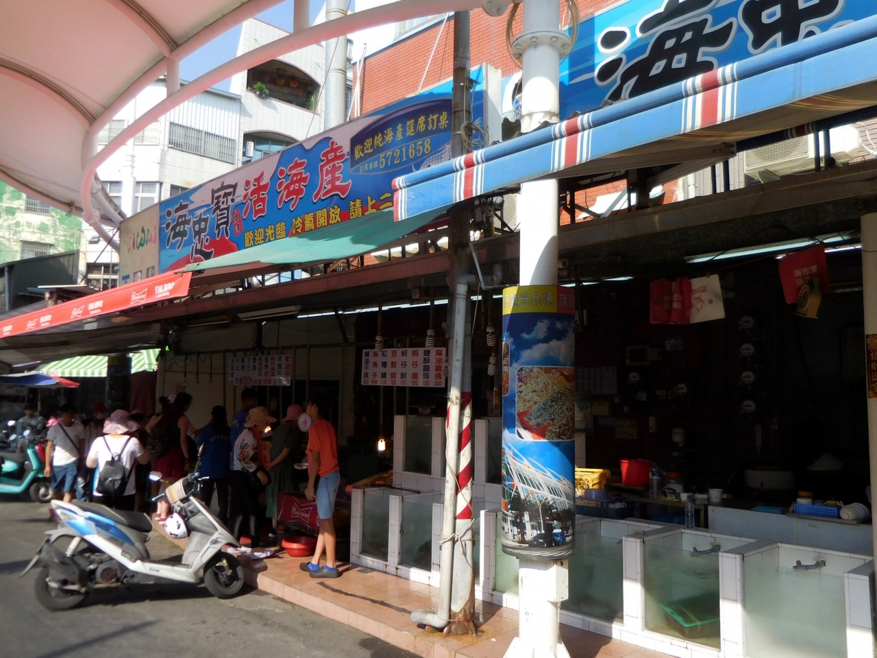 旗津半島へフェリーで渡って、屋台レストランが並ぶ目抜き通りを歩いて行くと左側に最初に見えてくる大きな店です。海鮮料理を扱ったお店がこの周辺にはたくさんありますが、店先に並んでいる魚介類に全部値段が書いてあり(どれもだいたい100元の札です)店員さんもある程度日本語を話せるという点で、この店が一番利用しやすいと思います。値段も安く、味は非常に美味しいです。