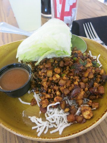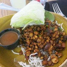 レタス巻きを試してみました。レタスにお肉とソースを乗っけて食べるという独特のスタイル。