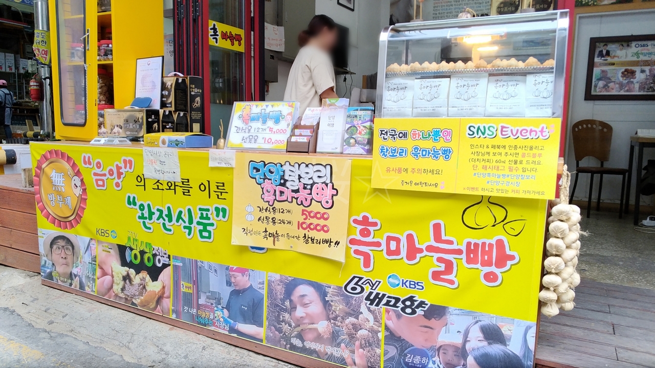 丹陽バスターミナルから徒歩圏内にある伝統市場で、丹陽名産のニンニクを使った飲食店が多く、ニンニクを使ったパンやアイスクリームもありました。