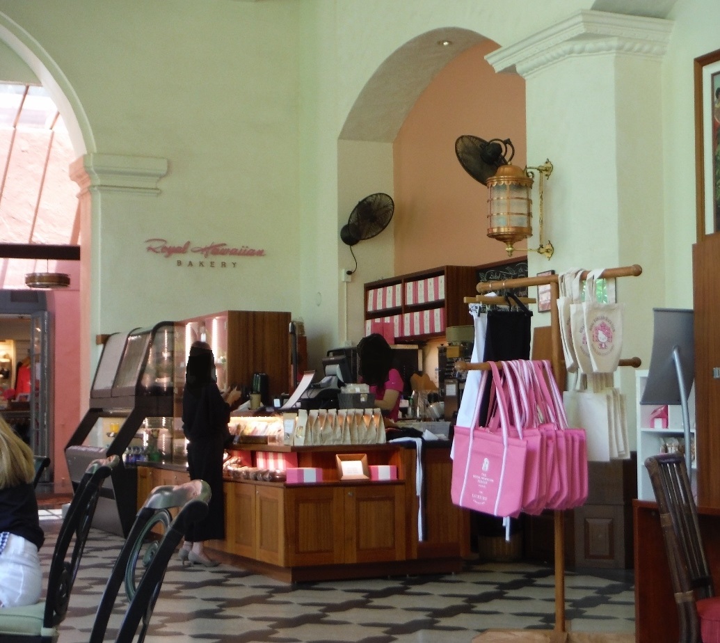 ロイヤルハワイアンホテルのショッピングセンター側のテラスにあります。パンとラテを頼んで目の前にイスとテーブルが置いてあるのでそちらでいただきました。バナナブレッドが美味しかったです。パイナップルのデニッシュは甘めです。庭の緑をみながらリラックスできます。キティちゃんのコラボ商品やホテルのクッキーなどお土産にも良さそうなグッズも販売しています。