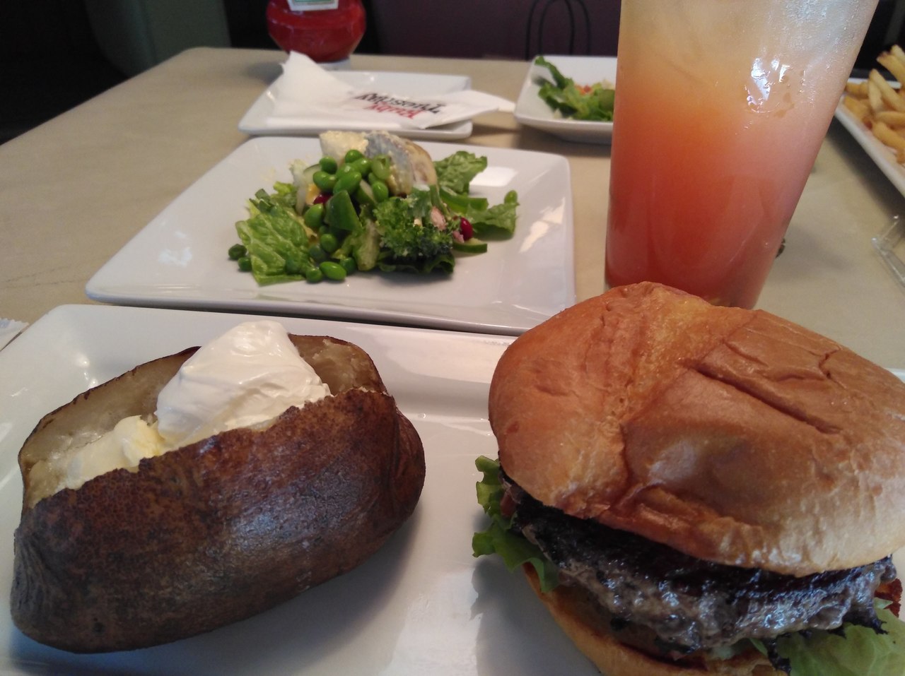 お店の雰囲気も良く、ランチでハンバーガー、ディナーではステーキ、サラダバーを食べましたが美味しく満足。ボリュームたっぷりです。ドリンクもとても美味しく、少なくなるとフレンドリーなスタッフが新しいものを持ってきてくれました。