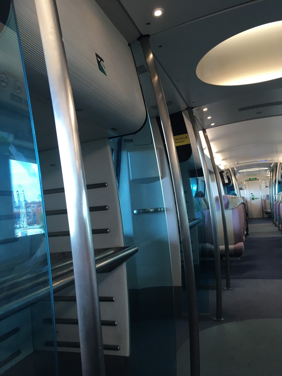 香港の空港から市内に行く際には改札すら通らずに乗れるのがさすがです。その場合は精算は友人窓口にて行います。車内では限られたシートですが、充電も出来ますし、荷物置き場も確保されています。値段は香港の公共交通機関にしては高いのですが、速さとインタウンチェックインの快適さは何にも変えられませんから。