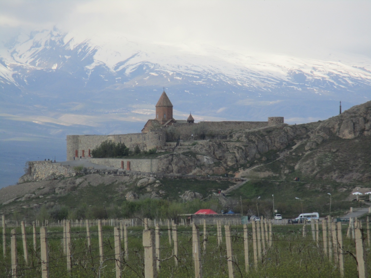 畑の中の小高い丘の上にホルヴィラップ修道院が立っており、それの背景にかすかにアララト山が見えました。