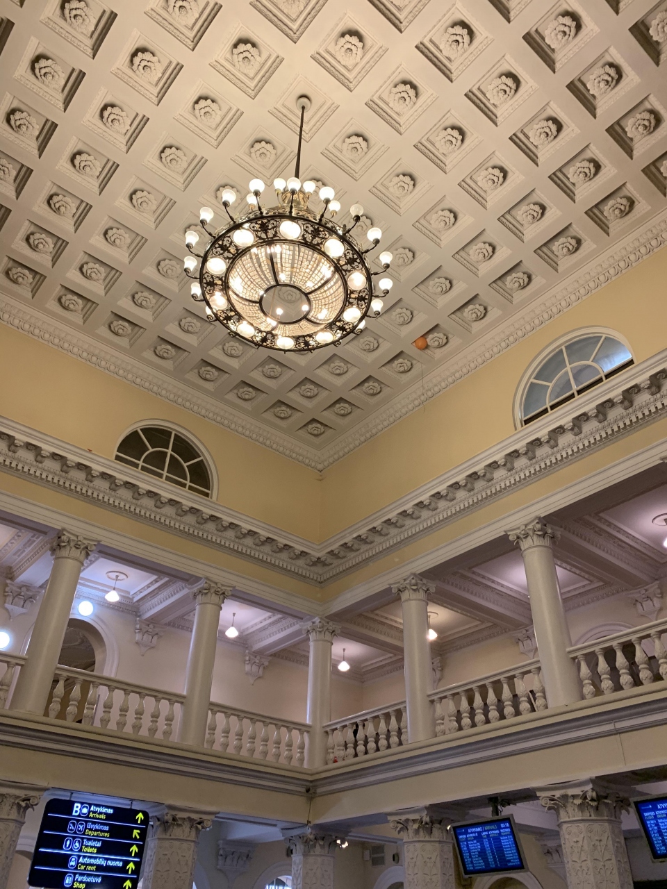夜遅く到着したが空港内にはかなり人で混雑していてカフェは満員。到着ロビーの天井が印象的だった。