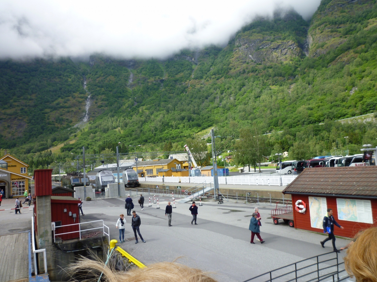 フロムの街は前は海、後ろは急峻な山々が迫り、その山々から流れるフロム川の谷に沿って、ほんの一握りの平坦地にできた狭い町。海ギリギリの地点まで鉄道が乗り入れ、駅と港は隣りあわせ。ひんやりした空気の下、景観も非常に良い。