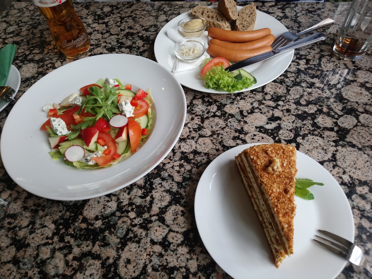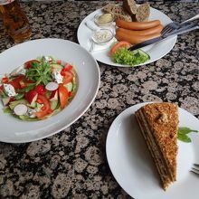 はちみつケーキとサマーサラダ、ソーセージなどを頼みました。