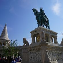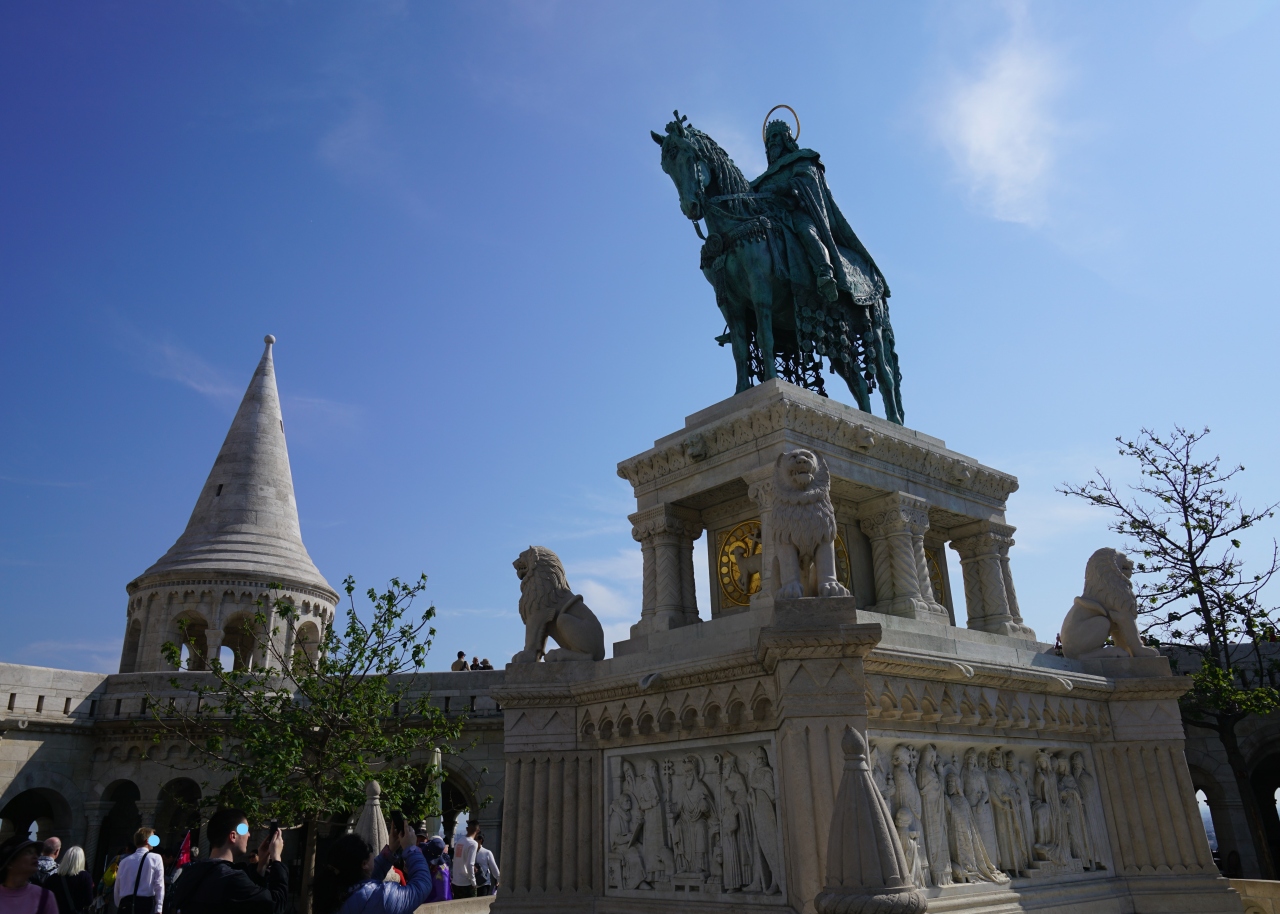 ブダペストでは、聖イシュトヴァーン大聖堂で有名なイシュトヴァーン。初代ハンガリー王でハンガリーのキリスト教化に貢献し、カトリック教会では聖人(聖イシュトヴァーン)として列聖されています。こちらの像は聖イシュトヴァーン大聖堂ではなく、マーチャーシュ教会の前にたつ騎馬像で、多くの人が記念撮影していました。