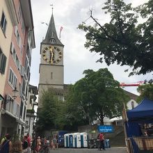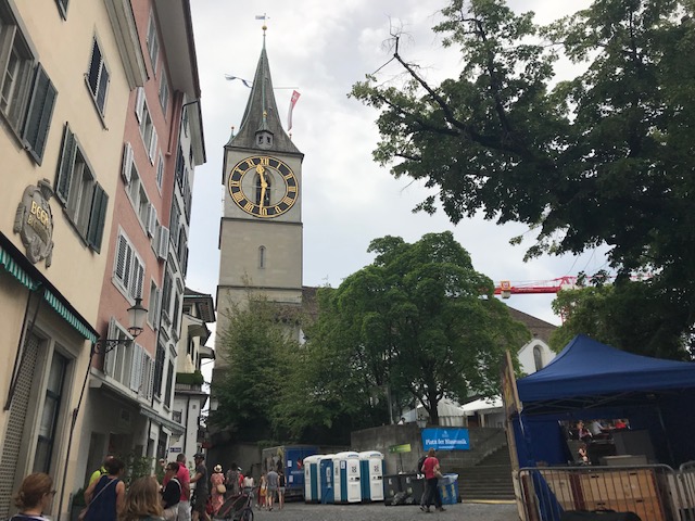 リンデンホフの丘からチューリッヒ湖の方向へ下っていくと、この聖ペーター教会がありました。教会の前の小さな広場では地元の方が演奏会を開いていました。チューリッヒではあちこちでこのような小さな演奏会が行われていて、音楽にあふれていました。教会内部はびっくりするほど質素なものでした。