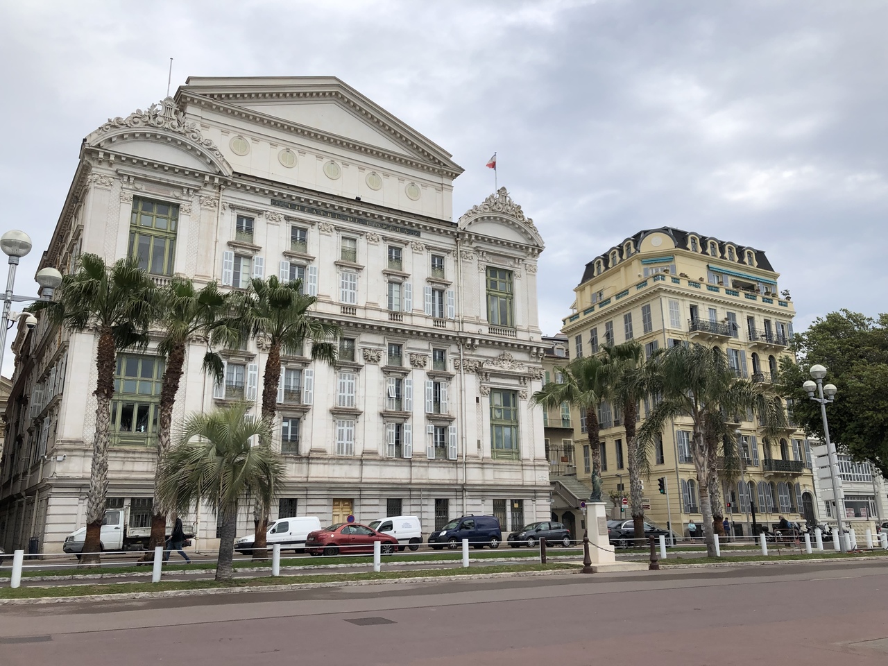 潮風にあたりながら朝のプロムナードデザングレを歩いていた際に写真を撮りました。オペラなどの演劇が好きな方は時間があればぜひ入館してください。外観だけでも美しい建物で、白さがコートダジュールの空に映えていました。