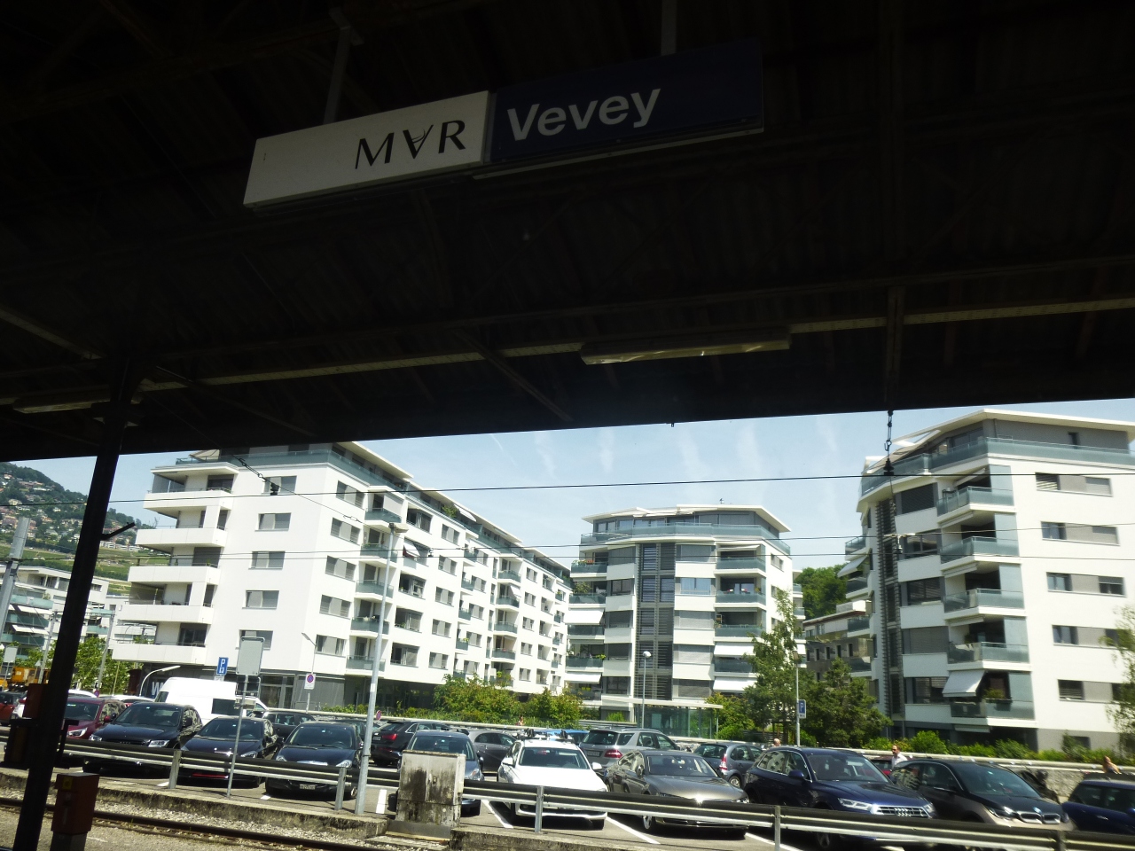Chexbrex(シェブレ)へのローカル線に乗り換えるためにモントルーから行ったが、モントルーからの本数も多かった。もっともシェブレ行きは待ち時間があったけれど。駅裏側?には近代的なアパート群があり、表側?は何か音楽的なイヴェントがあるみたいな派手な看板が立っていた。