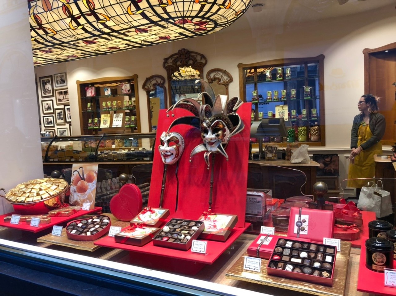 有名なチョコレート屋さんは、ほとんど有りました。ウィンドウには、観ているだけでも楽しくなるオブジェの様な、チョコも…。屋根が有るので、天気も気にせず買い物が出来ました。とにかく、おしゃれな街並みです。