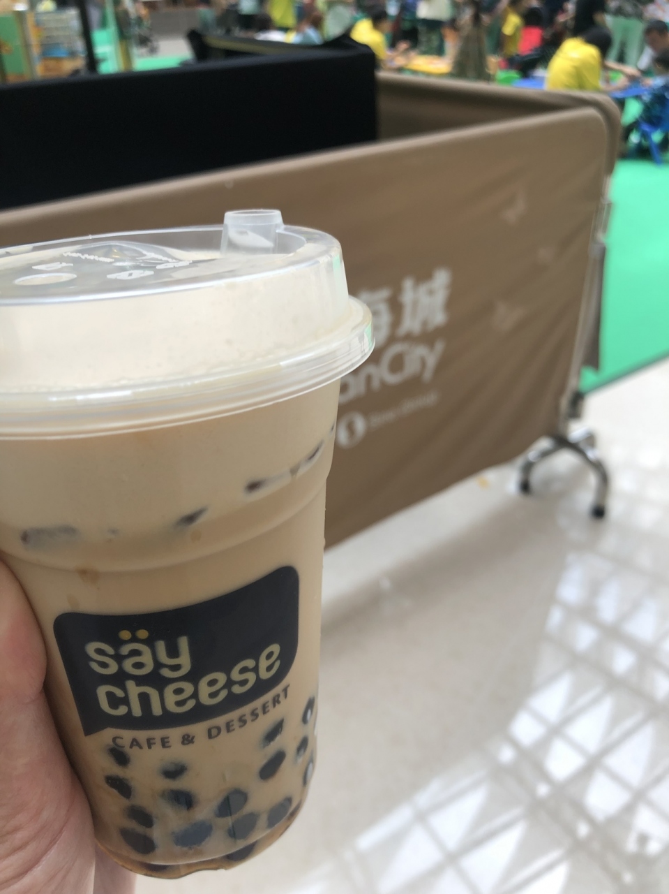 飲食店もはいってます。タピオカミルクティーを飲みたくなってかったのですが、館内にはベンチや座る場所がほぼないので、休憩したい時は席のあるお店に入るのが確実そうです。