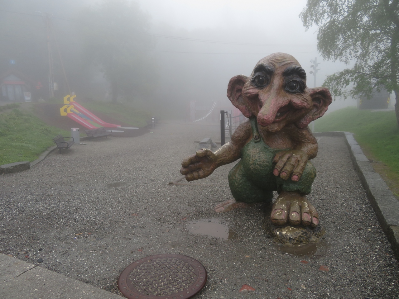 本来、天気さえ良ければフロイエン山の頂上からはベルゲンの街並みがきれいに見られるはずでしたが、私が行った時は雨が降っていて、山の中腹から上には霧がかかっていました。一途の望みを持ちケーブルカーで上に登りましたが、辺りは真っ白で一寸先も見えない程でした。頂上にはレストランや子供向けの公園などがありました。