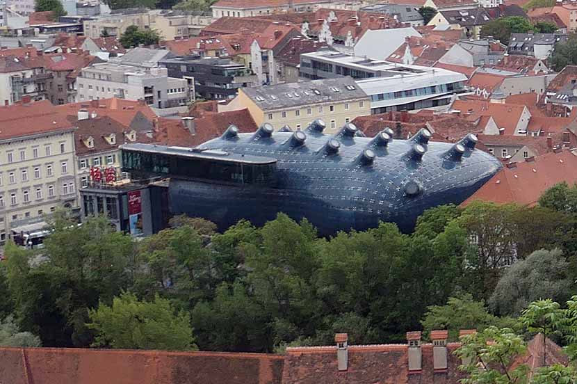 シュロンベルグの丘から眺めるグラーツ旧市街の景観の中に、黒っぽい妙な形をした建物がありました。赤茶や白系の中世風の家並みに囲まれた黒色でガマガエルあるいなナマコのような建造物でした。旧市街を散策した際に行ってみました。近くから見ると、あまり違和感を感じないこの黒色系の建物は近現代の作品が展示されている美術館でした。